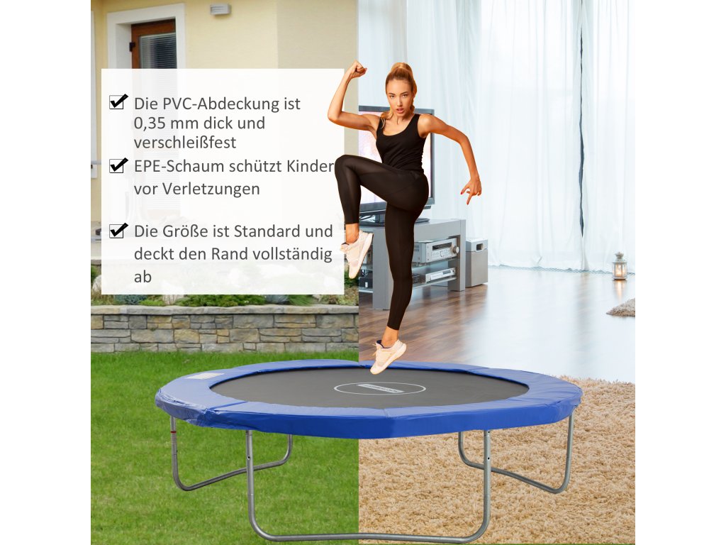Užijte si zábavu venku s pomocí tohoto náhradního polstrování na trampolínu. Chrání pružiny a ocelové hrany zařízení a vytváří tak měkčí povrch po celém obvodu, což zajistí, že vy ani vaše rodina nebudete mít modřiny a škrábance. Chrání také skákajícího před pádem na ocelový rám nebo zraněním o pružiny. Bezpečnostní podložka na trampolínu byla vyvinuta speciálně pro zahradní trampolínu s kulatým rámem a je vyrobena z odolné pěny s uzavřenými buňkami o vysoké hustotě, která pohlcuje nárazy, neabsorbuje vodu, neplesniví a neztrácí svůj tvar. poznámka: Změřte si prosím předem svou trampolínu a délku spirálových pružin, abyste předešli objednání nesprávných pružin. Pro dlouhé spirálové pružiny můžete potřebovat širší potah.