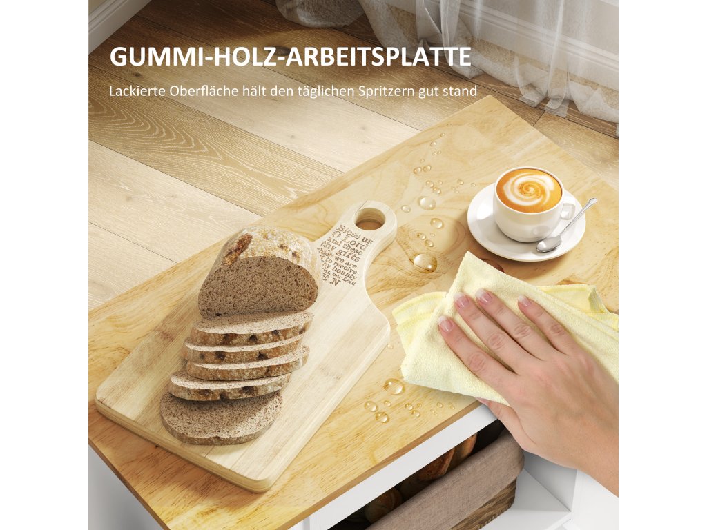 - Robustní konstrukce: Robustní a hladká pracovní deska z kaučukového dřeva tohoto vozíku je ideální pro přípravu potravin. Její lakovaný povrch se navíc snadno čistí