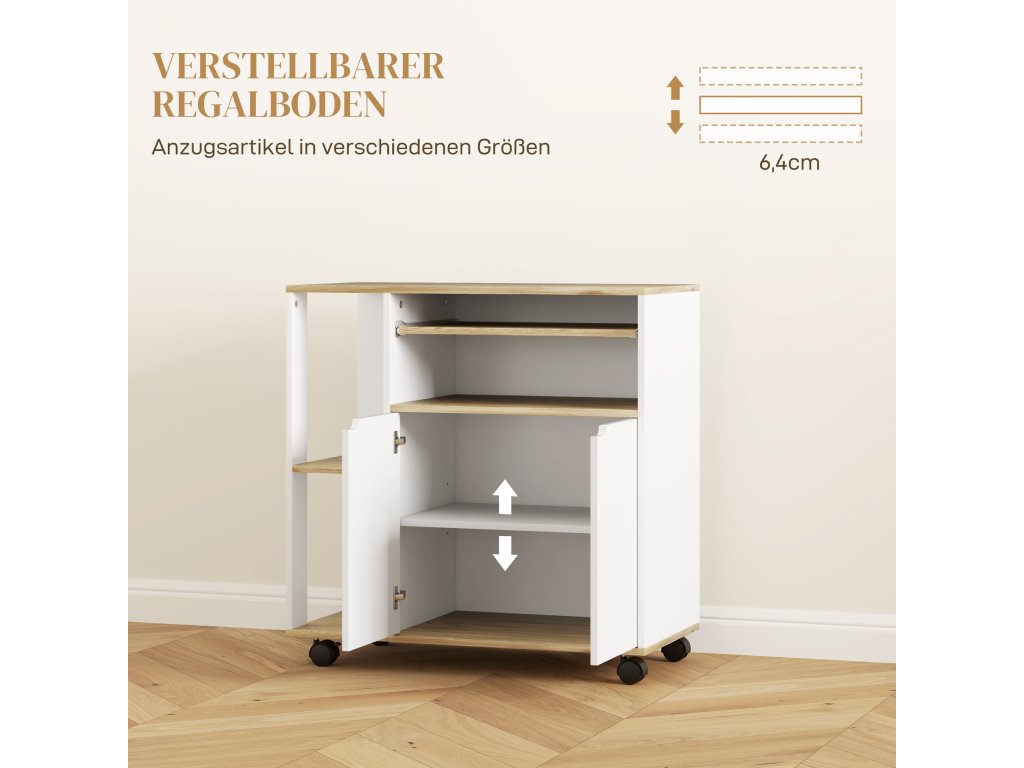 HOMCOM Kuchyňský vozík na kolečkách s úložným prostorem, skříňka, nastavitelné police, do kuchyně, obývacího pokoje, jídelny, bílý