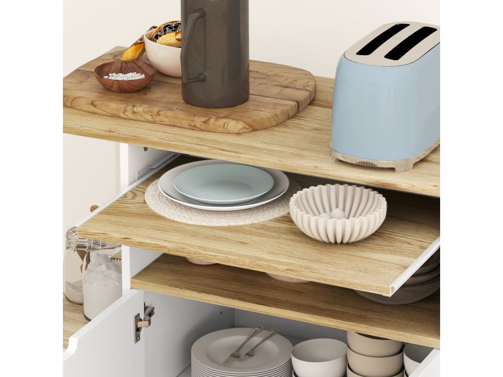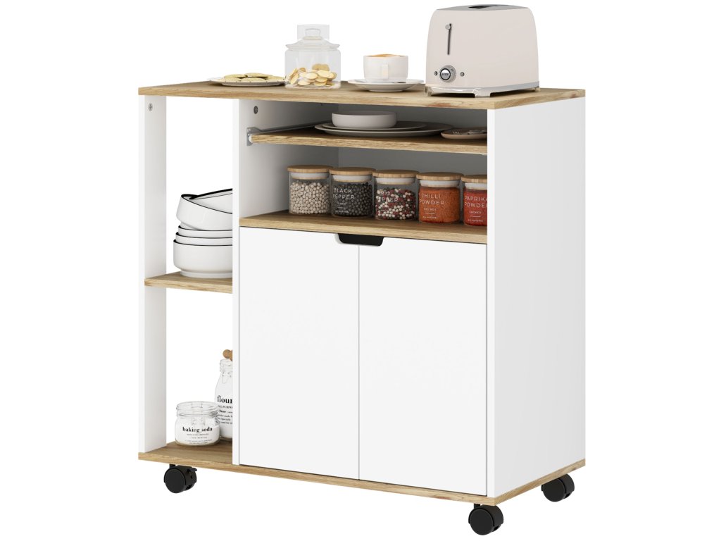 Optimalizujte svou domácnost s kuchyňským vozíkem HOMCOM! Různé možnosti ukládání usnadňují přípravu a servírování jídel. Obsahuje prostornou pracovní plochu pro přípravu pokrmů a výsuvnou polici na krájecí prkénka, pečicí papír a fólii. Koření lze přehledně uložit na malých bočních policích. Skříňka kuchyňského vozíku s dvojitými dveřmi a nastavitelnou vnitřní policí nabízí také flexibilní úložný prostor pro hrnce a pánve.
