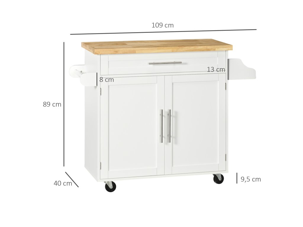 - Údaje o výrobku kuchyňského vozíku: 109 Š x 40 H x 89 V cm, nosnost: 40 kg (celkem), 20 kg (pracovní deska), 8 kg (zásuvka), 8 kg (police)
