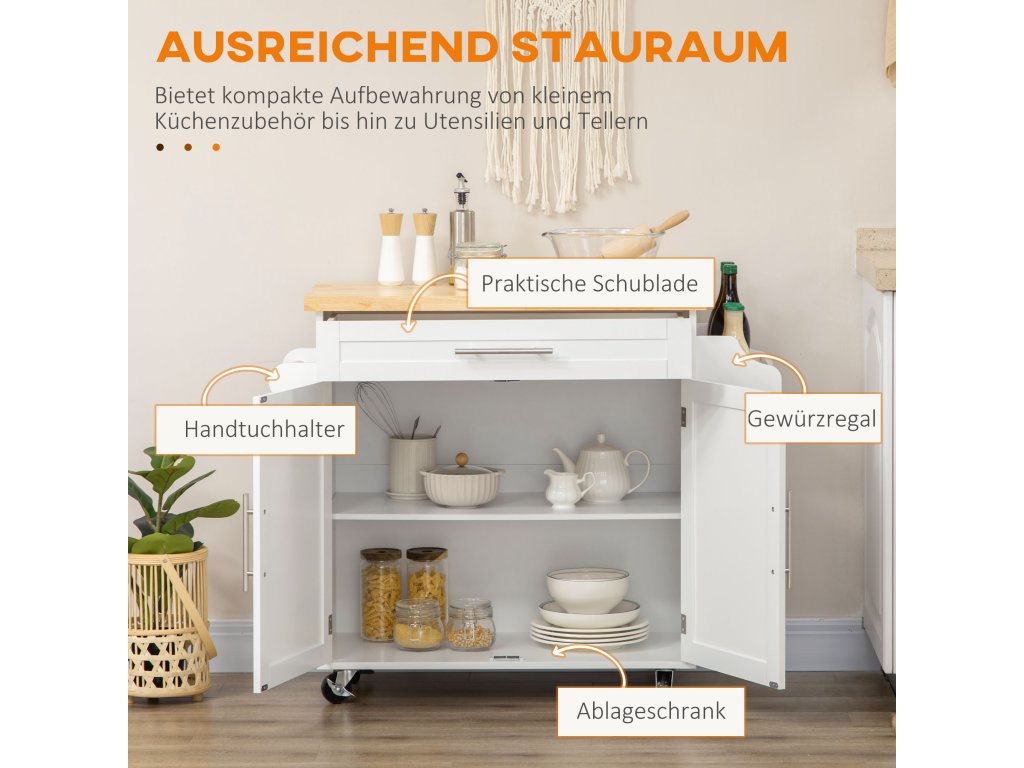 - Dostatek úložného prostoru: Velká zásuvka a uzavřená skříňka nabízejí dostatek prostoru pro kuchyňské náčiní a potraviny. Vozík je vybaven stojanem na kořenky a držákem na ručníky