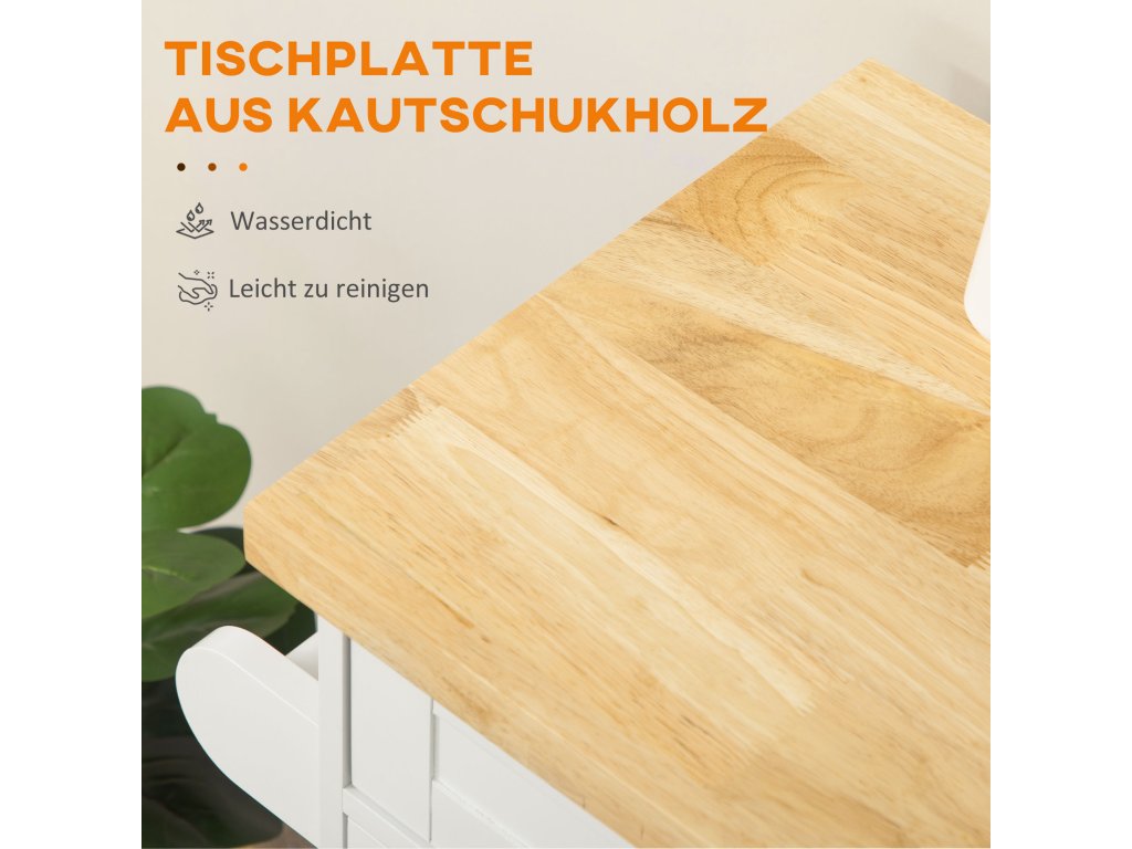 - Odolný materiál: Pracovní deska kuchyňského vozíku je vyrobena z voděodolné pryže a dřeva MDF, a proto je odolná a snadno se čistí
