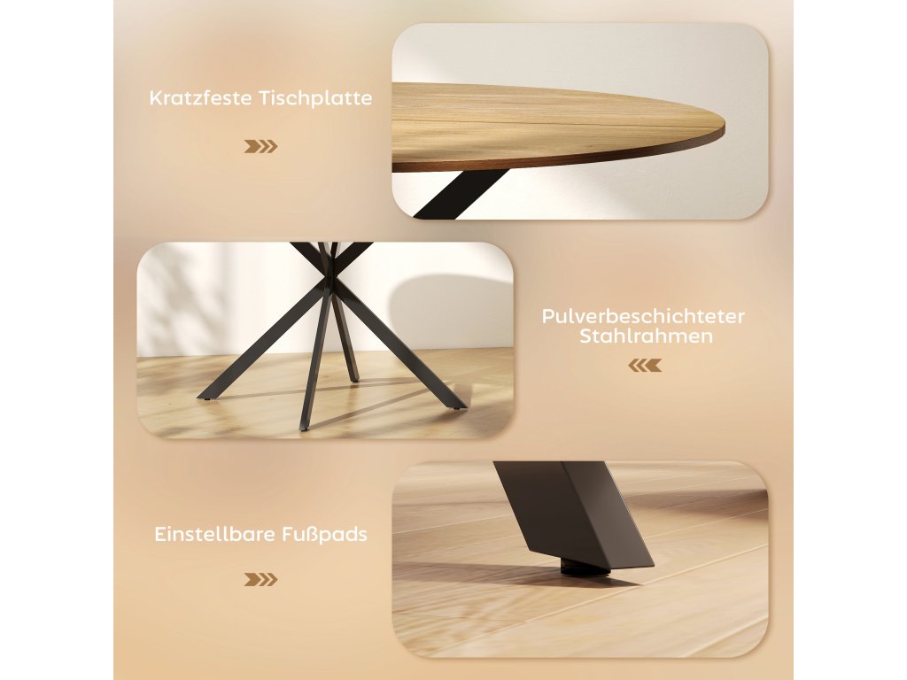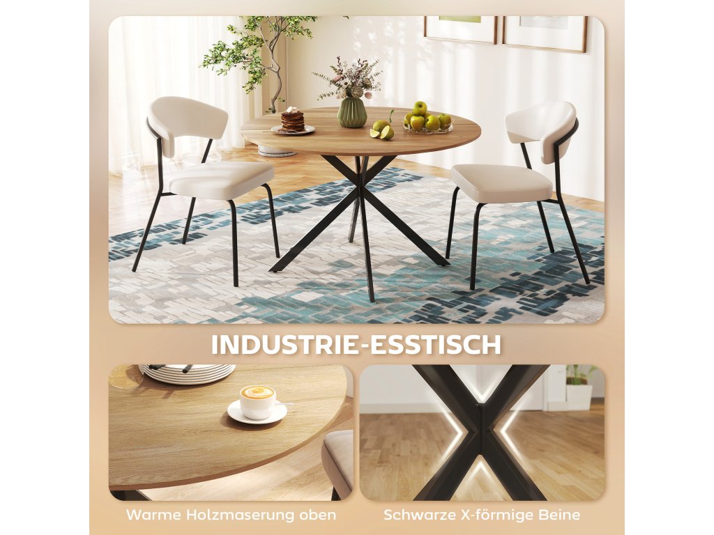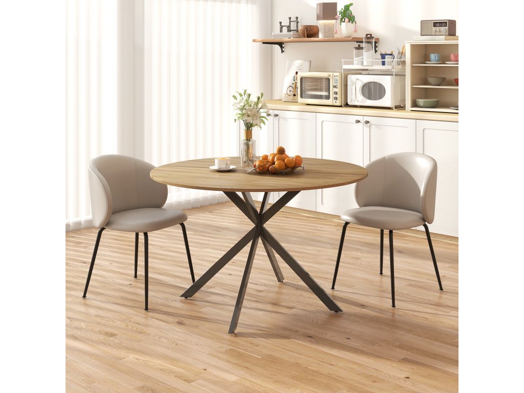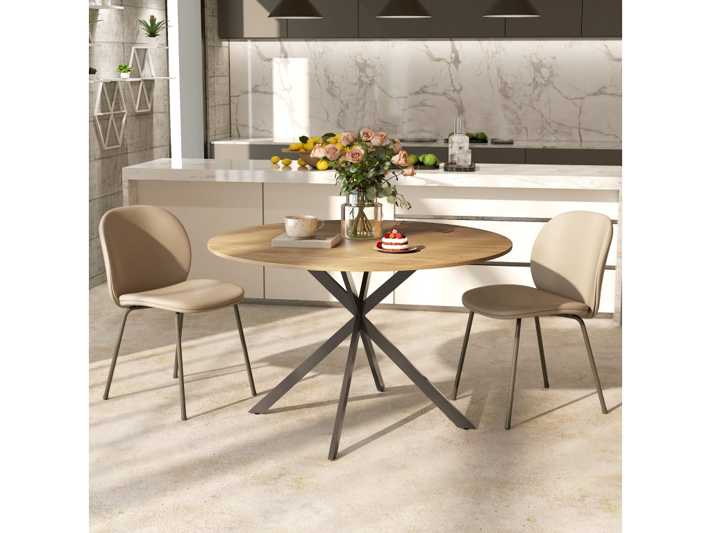 Tento kulatý jídelní stůl má povrch ve vzhledu dřeva a poutavé nohy ve tvaru písmene X představují dokonalou kombinaci útulnosti a stylu. Kuchyňský stůl pro čtyři osoby je ideální pro pohodové pozdní snídaně, živé herní večery nebo večeře při svíčkách. Díky nastavitelným podložkám pod nohy zůstává stabilní i na nerovných podlahách.