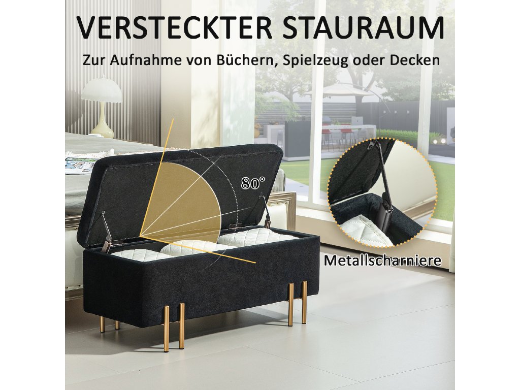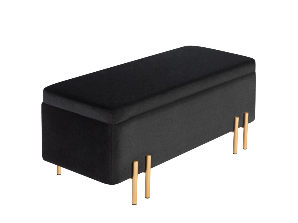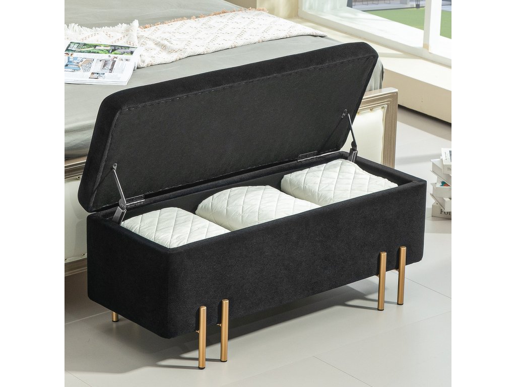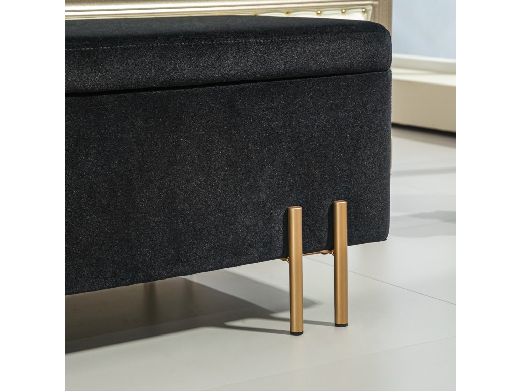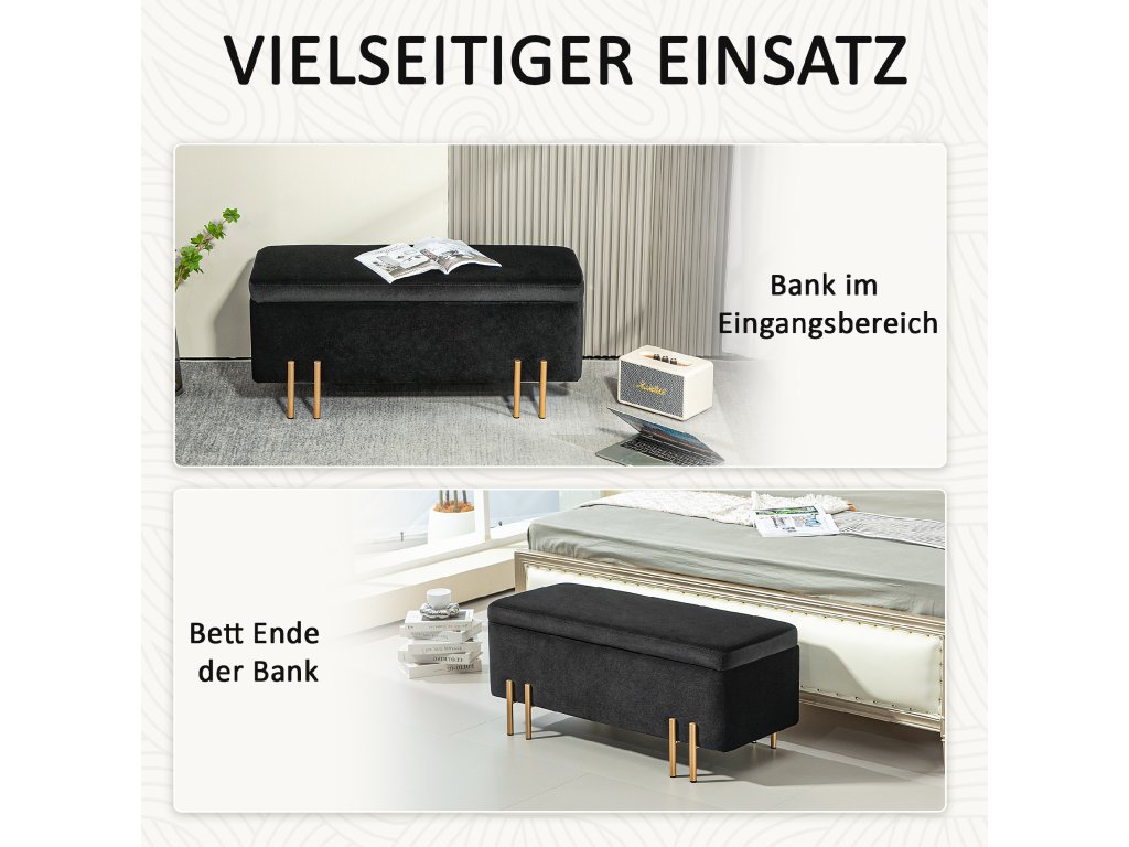 - Klasický design: Sedací truhla s úložným prostorem je vyrobena z vysoce kvalitního polyesteru měkkého na dotek, vyplněného 4 cm silnou pěnou. Elegantní vzhled jí dodávají pozinkované kovové nožky