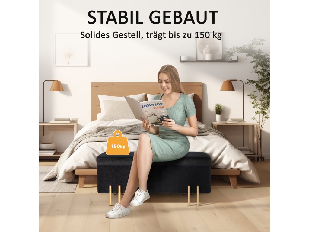 - Kvalitní a stabilní: Tato lavice s úložným prostorem je vyrobena z kvalitního dřevěného rámu a pozinkovaného kovu, který zajišťuje stabilitu. Lze ji použít jako podnožku, taburet k posteli a úložný box