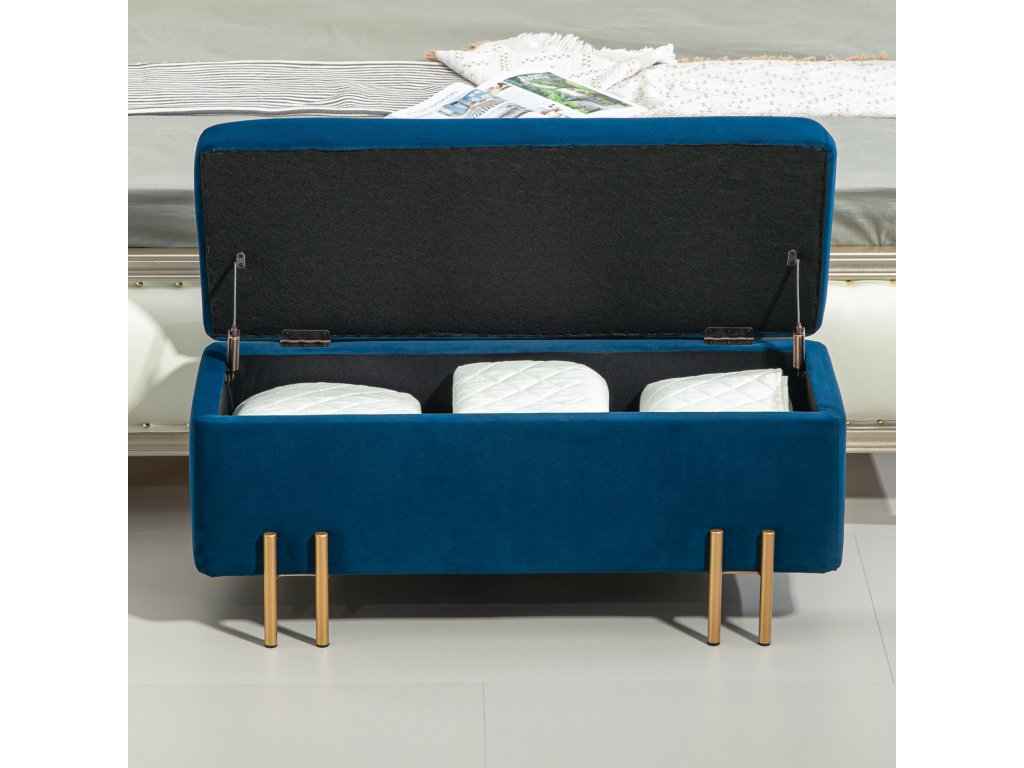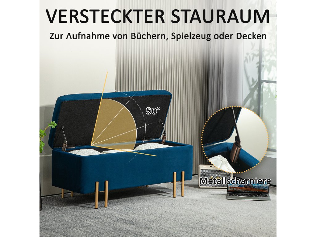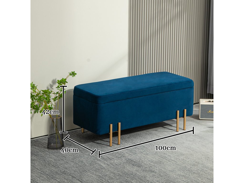 HOMCOM Lavice, čalouněná lavice s úložným prostorem, kov, kaučukové dřevo, pěna, 100 x 40 x 42 cm, tmavě modrá