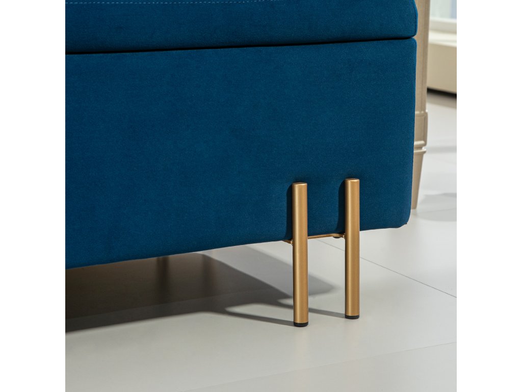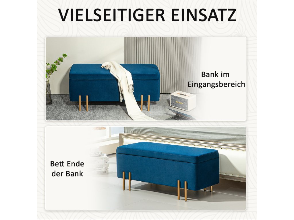 - Klasický design: Sedací truhla s úložným prostorem je vyrobena z vysoce kvalitního polyesteru měkkého na dotek, vyplněného 4 cm silnou pěnou. Elegantní vzhled jí dodávají pozinkované kovové nožky
