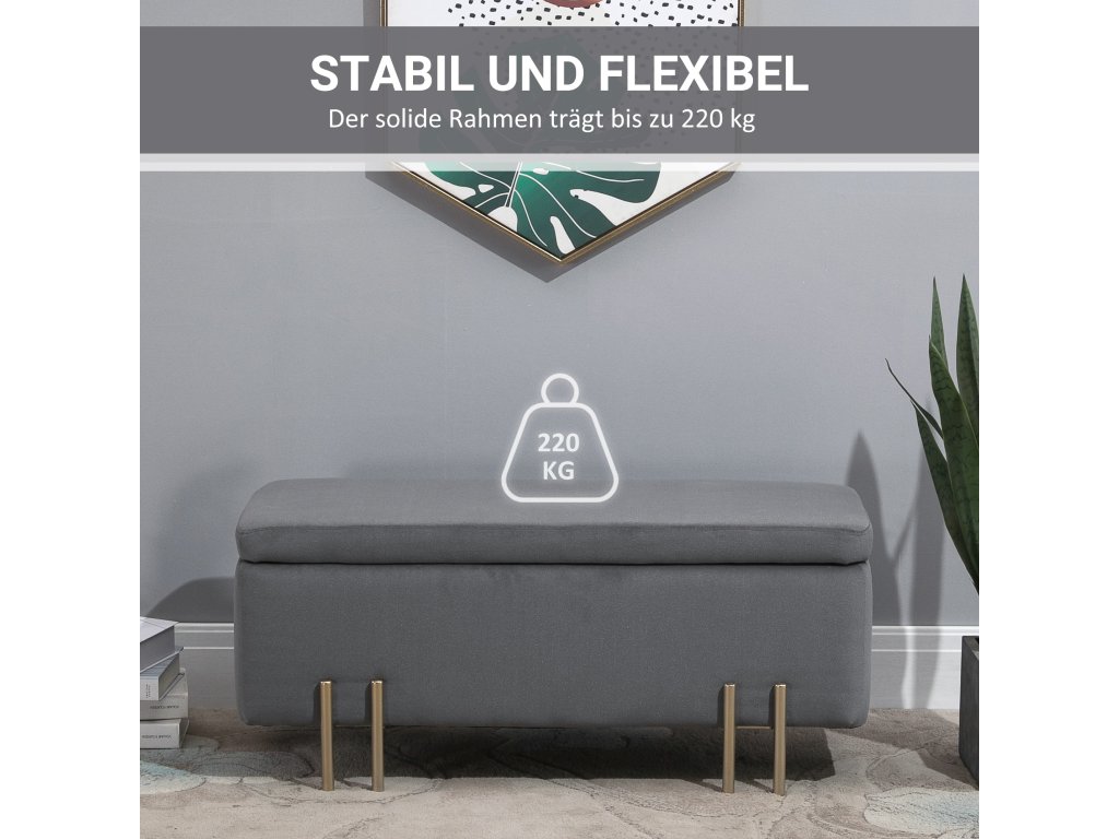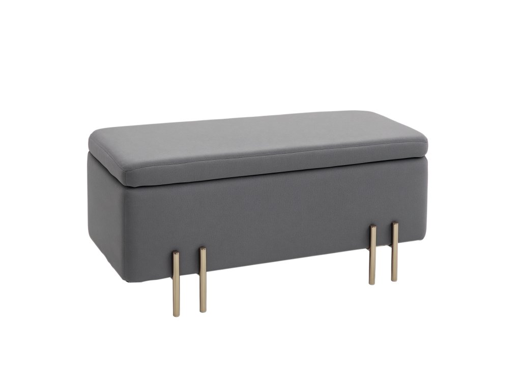 - Klasický design: Sedací truhla s úložným prostorem je vyrobena z vysoce kvalitního polyesteru měkkého na dotek, vyplněného 4 cm silnou pěnou. Elegantní vzhled jí dodávají pozinkované kovové nožky