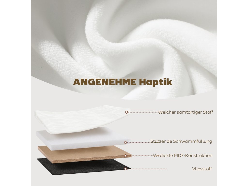 - ✔ Materiál: látka se sametovým vzhledem (100% polyester), netkaná textilie, MDF, pěna