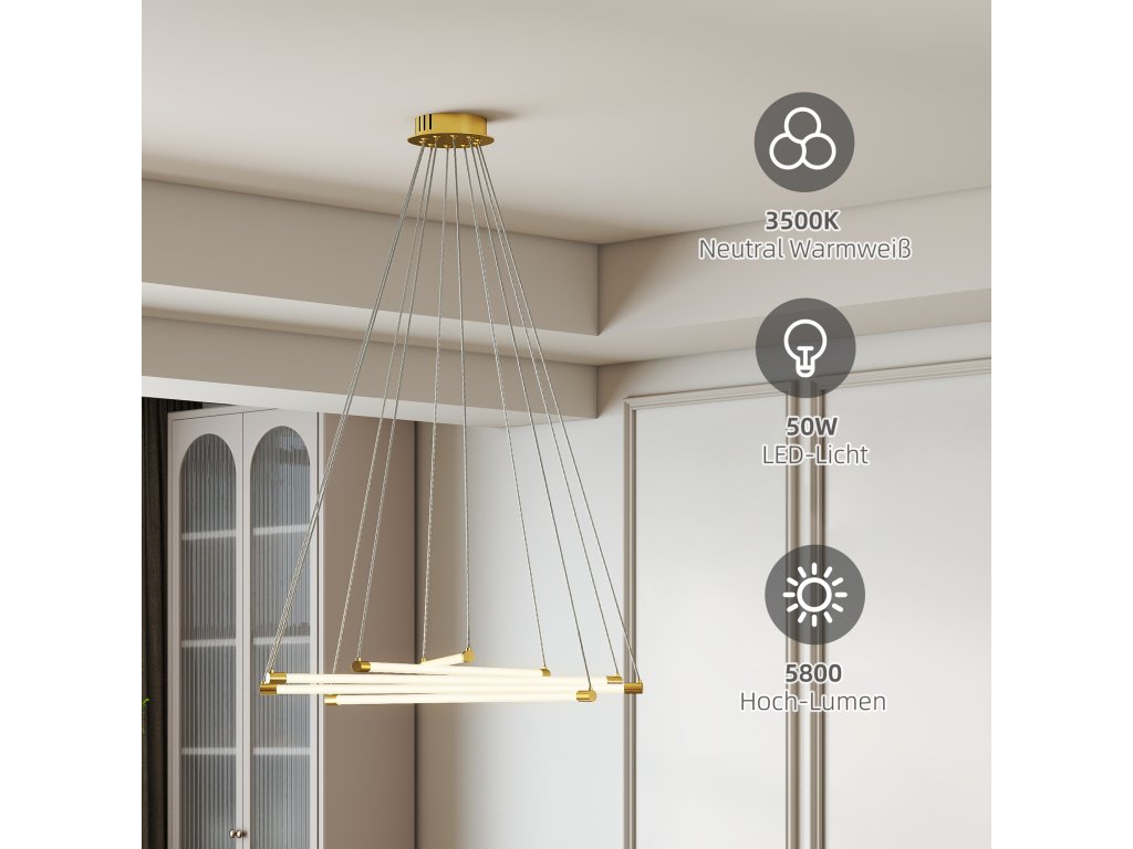 - Závěsné LED svítidlo: 50W LED světlo je jemně rozptýleno přes mléčné akrylové kryty závěsného svítidla a poskytuje jasné teplé světlo 5800 lm při teplotě 3500 K - ideální pro plné osvětlení místnosti a zároveň vytvoření útulné, příjemné atmosféry pro stolování nebo společenské setkání