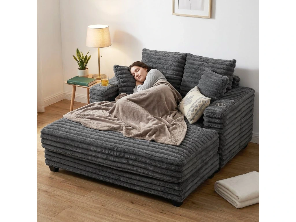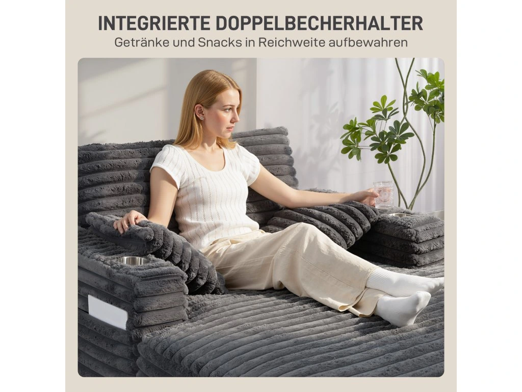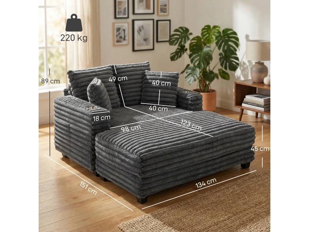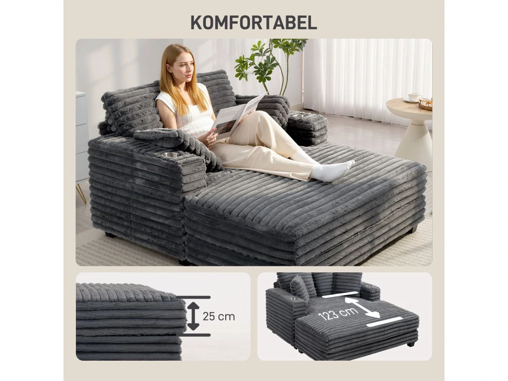 Už vás nebaví přeplněné večery a přerušované filmové večery? Toužíte po útočišti, kde si můžete skutečně odpočinout, ale chybí vám místo pro dva? Rozkládací pohovka HOMCOM promění váš obývací pokoj. Zabořte se do měkkých manšestrových polštářů o hloubce 123 cm. Vestavěné držáky na nápoje udrží vaše nápoje v bezpečí a vytvoří uvolněnou atmosféru. Tato pohovka je vaším místem pro společný odpočinek a sdílení krásných chvil.