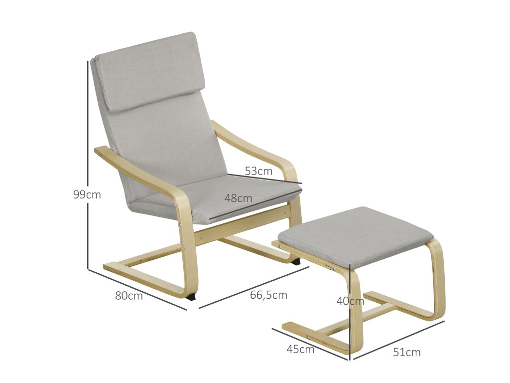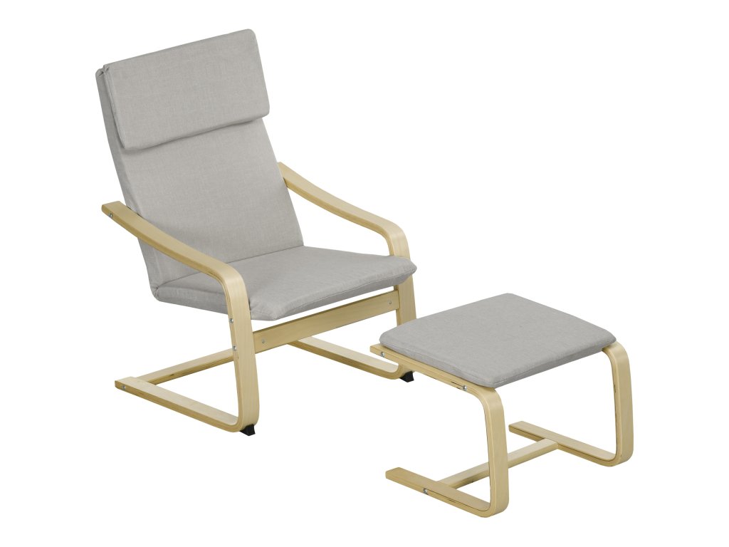 HOMCOM lounge křeslo s taburetem, potah ve vzhledu lnu, dřevěný rám, do 120 kg, světle šedá/přírodní barva