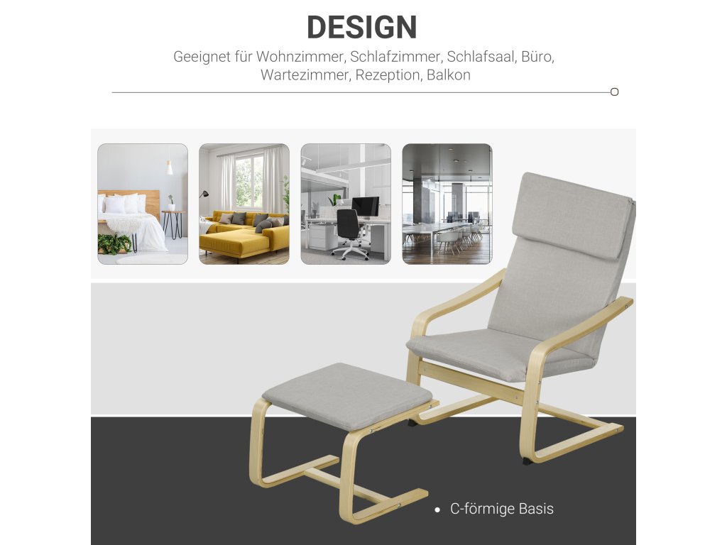 - Jednoduchý a klasický design: sada křesel pro odpočinek sestávající z křesla a podnožky. Vnější materiál ve vzhledu lnu a dřevěný rám ve tvaru písmene C dělají z této soupravy křesel dekorativní variantu posezení do obývacího pokoje, ložnice a mnoha dalších prostor.