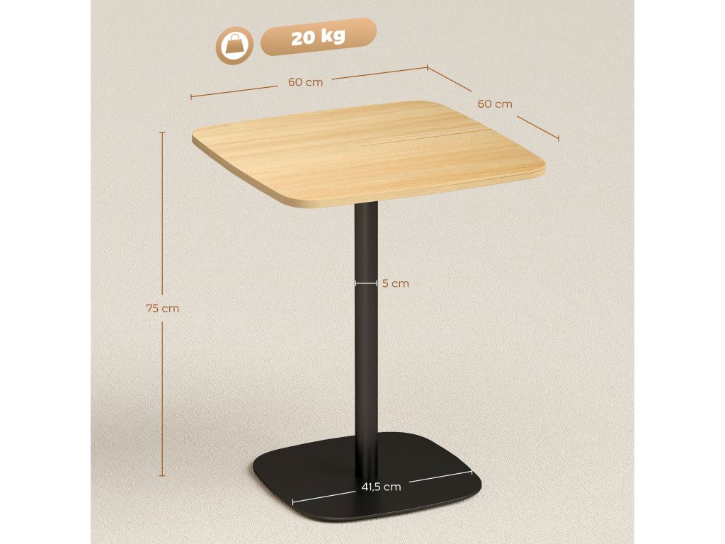 HOMCOM Malý jídelní stůl, 60 cm, čtvercový, deska z MDF, ocelová podnož, do obývacího pokoje, jídelny, kuchyně, přírodní dřevo+černá barva