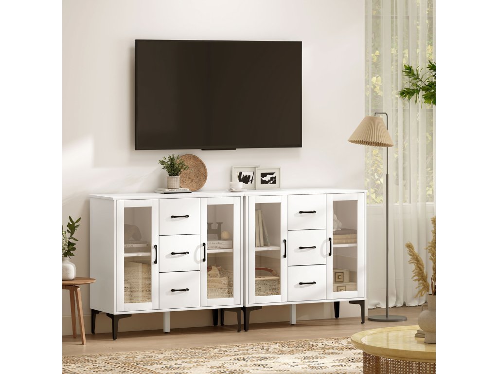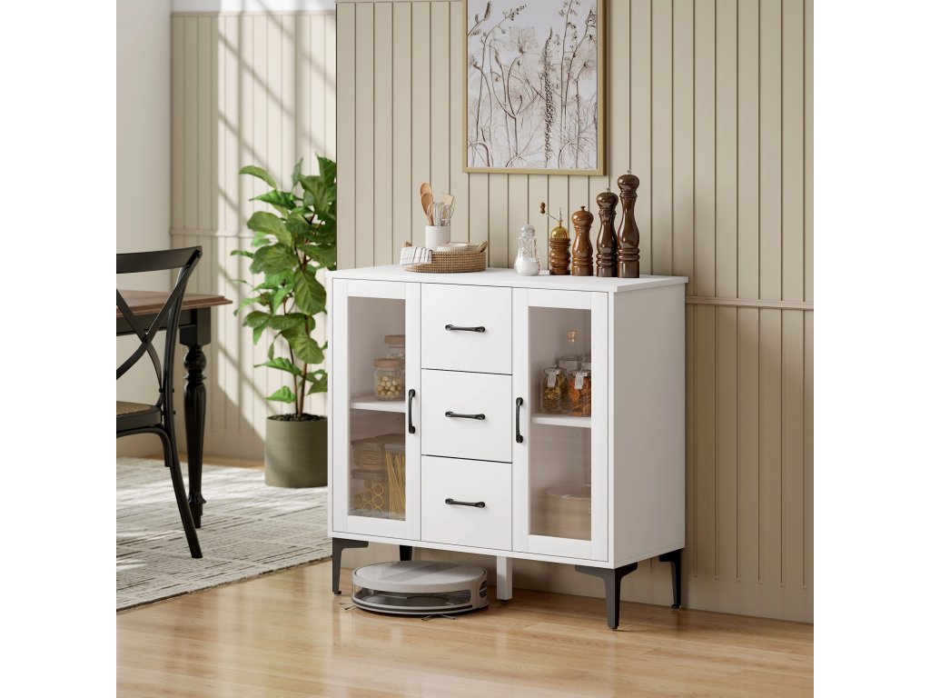 HOMCOM Moderní příborník s dvířky s tichým dovíráním, bufetová skříňka se 3 zásuvkami, 2 prosklená dvířka, nastavitelné police, MDF, bílá barva