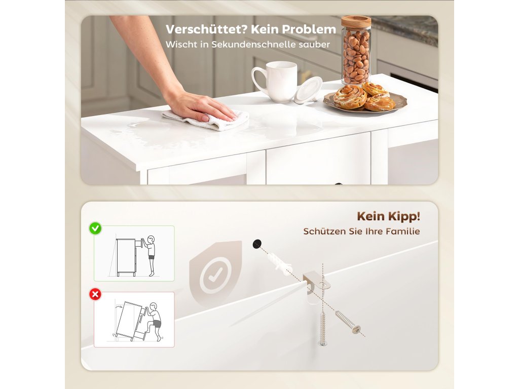 - Tiché a bezpečné zavírání: Díky pantům s tichým zavíráním se dvířka kuchyňského bufetu zavírají jemně a tiše a poskytují ochranu prstů při každodenním používání - ideální pro rušné domácnosti a pohodové večery v klidu
