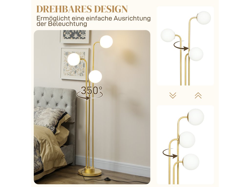 Osvětlete své pokoje stylově pomocí stojací lampy HOMCOM. Má tři nastavitelná stínidla, která lze otáčet v rozsahu 350°, a nabízí tak flexibilní možnosti osvětlení. Elegantní, moderní design stojací lampy do obývacího pokoje s rámem ve zlaté barvě a matnými bílými stínidly dodá každé místnosti zvláštní nádech. Díky robustní kulaté základně stojací lampa bezpečně stojí a upoutá pozornost kdekoli, ať už vedle pohovky, nebo v rohu.