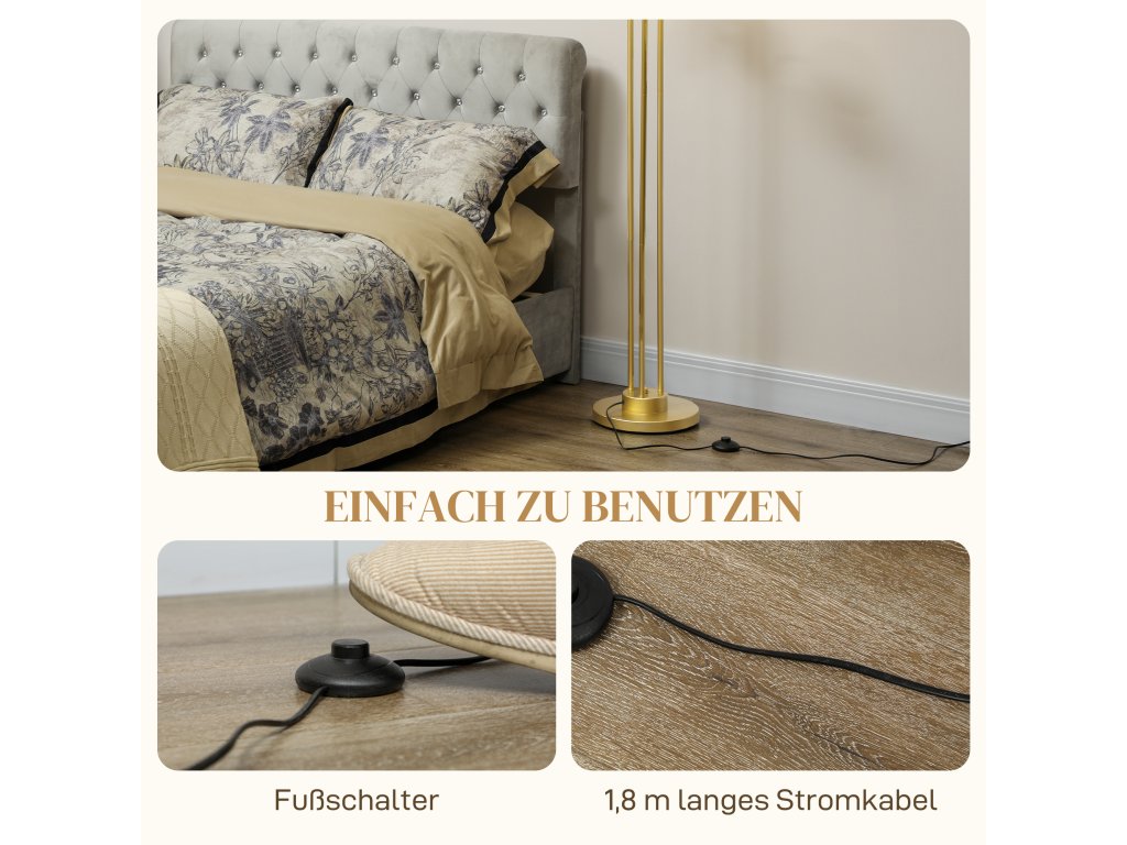 HOMCOM Moderní stojací lampa se 3 stínidly, s nožním vypínačem, do obývacího pokoje, ložnice, 3 x patice E27, zlatý odstín