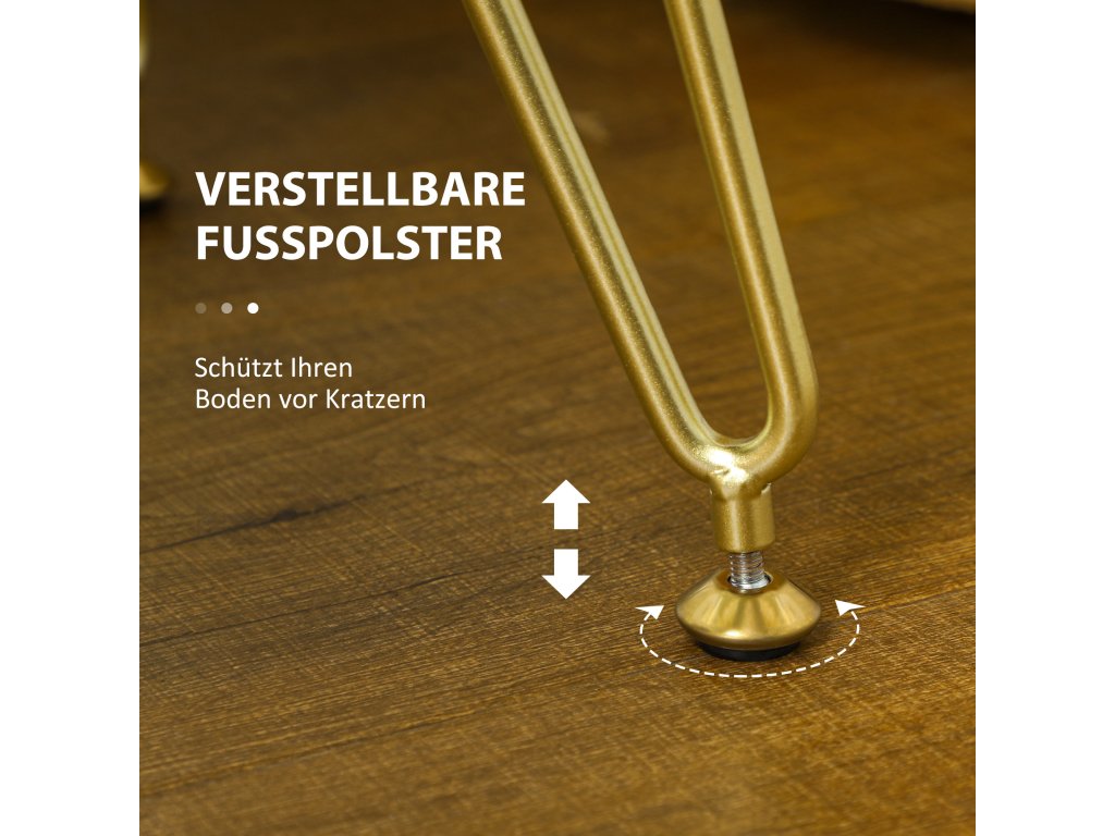 - Pozlacené kovové nožky: Nejenže poskytují pevnou oporu, ale svou výraznou kontrastní barvou také umocňují vzhled. Nastavitelné podložky pod nohy stoličky zajišťují dodatečnou stabilitu, a proto jsou vhodné pro jakoukoli podlahovou krytinu