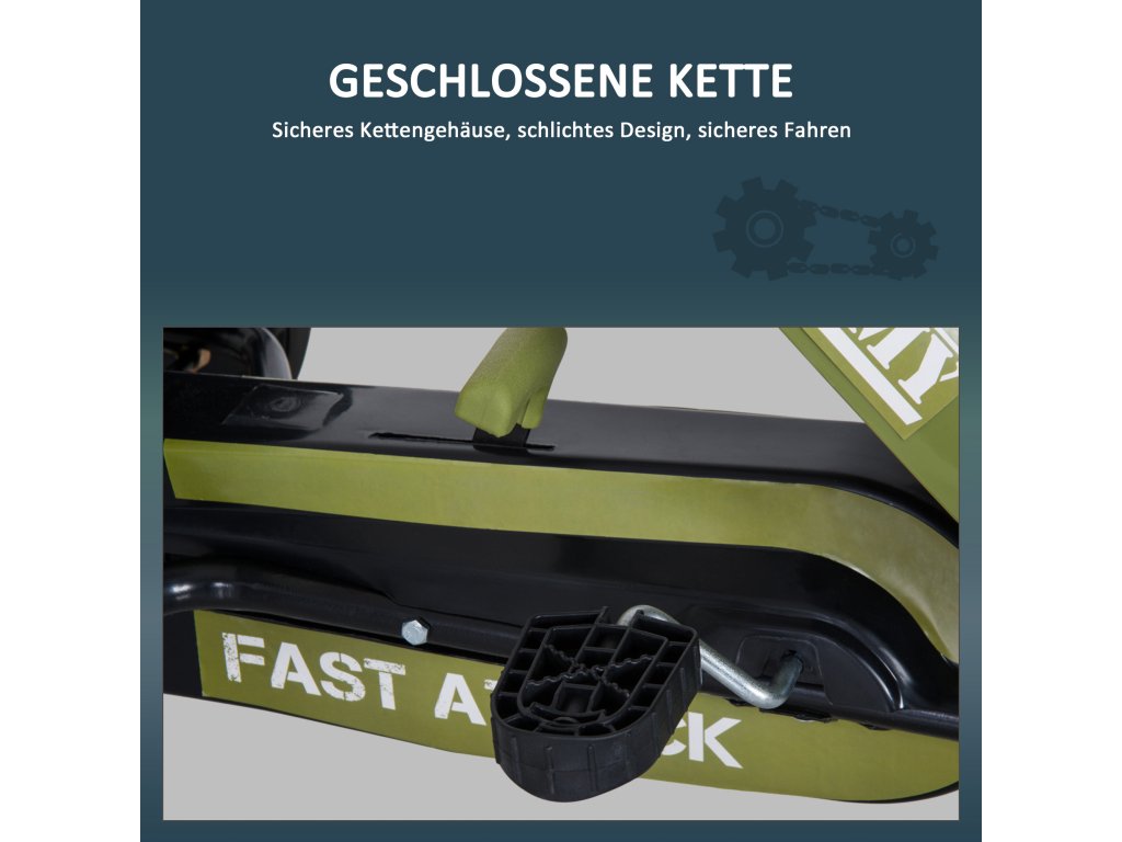 S naší dětskou motokárou od společnosti HOMCOM je zábava z jízdy na prvním místě. Odolný armádní design dětského vozítka vyvolává chuť vyjet ven, takže hodiny zábavy při jízdě a hraní jsou zaručeny. Řetězový pohon je bezpečně ukrytý pod blatníkem a brzdí se pomocí ruční brzdy. Díky tomu vaše dítě bezpečně zastaví i v plné rychlosti. Lze ji flexibilně nastavit dopředu nebo dozadu, aby váš malý závodník vždy pohodlně seděl.