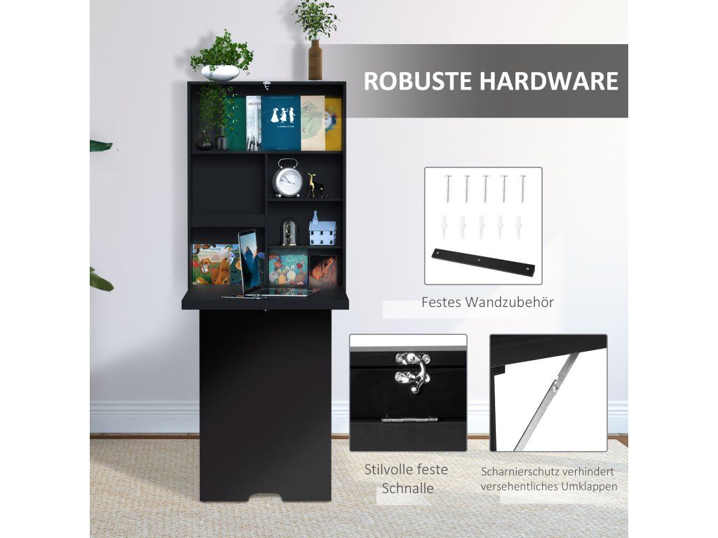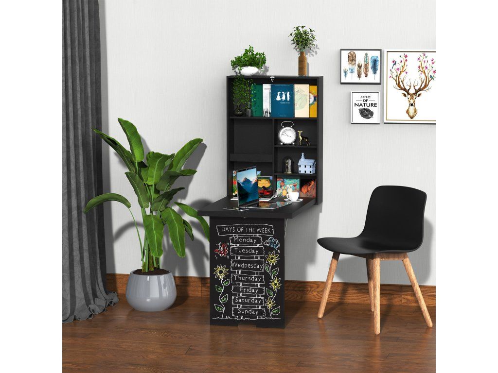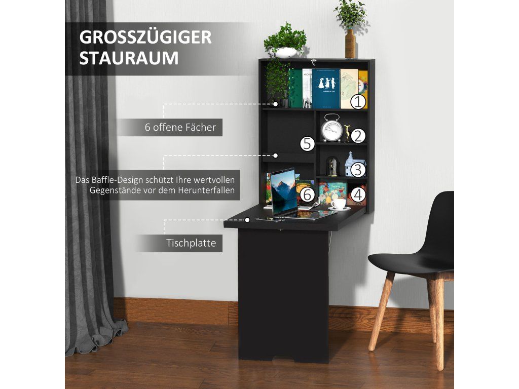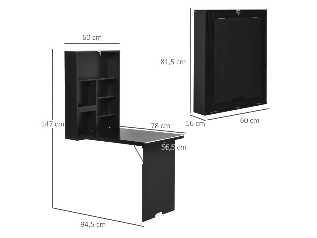 HOMCOM Nástěnný skládací psací stůl Nástěnný psací stůl včetně psacího tabletu, 60 cm x 94,5 cm x 147 cm, černý