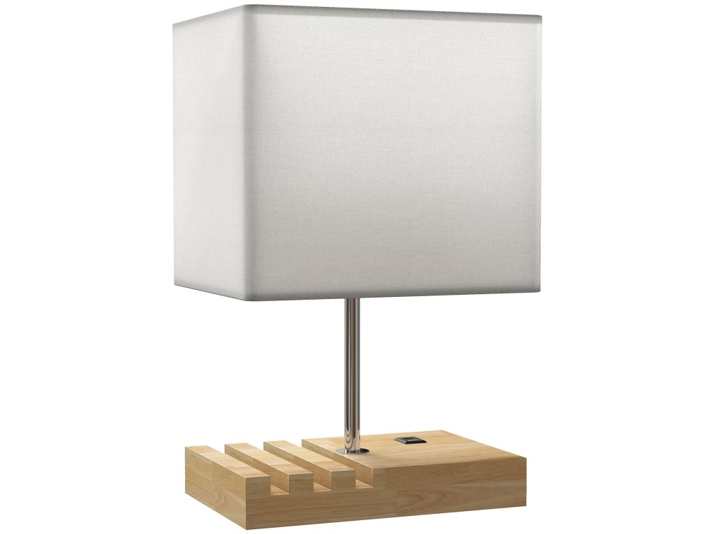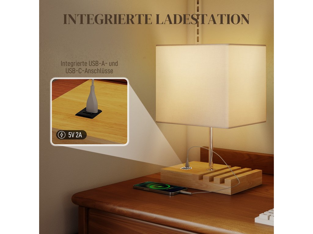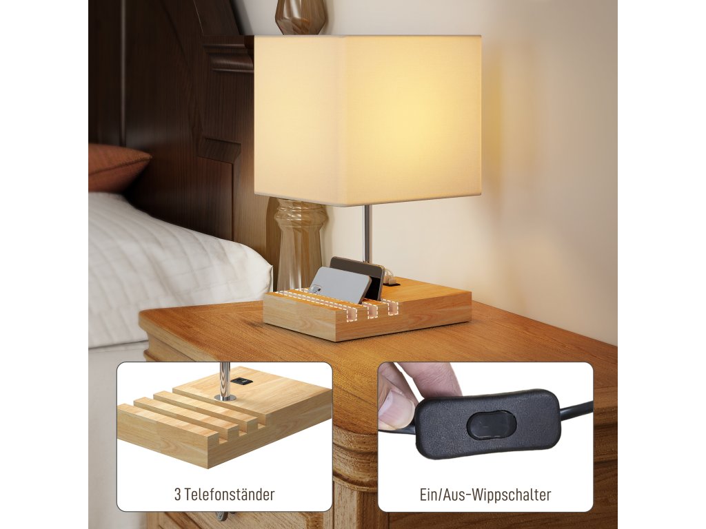 HOMCOM Noční lampička, USB porty, dřevo, látka, kolébkový vypínač, úložné prostory, bílá