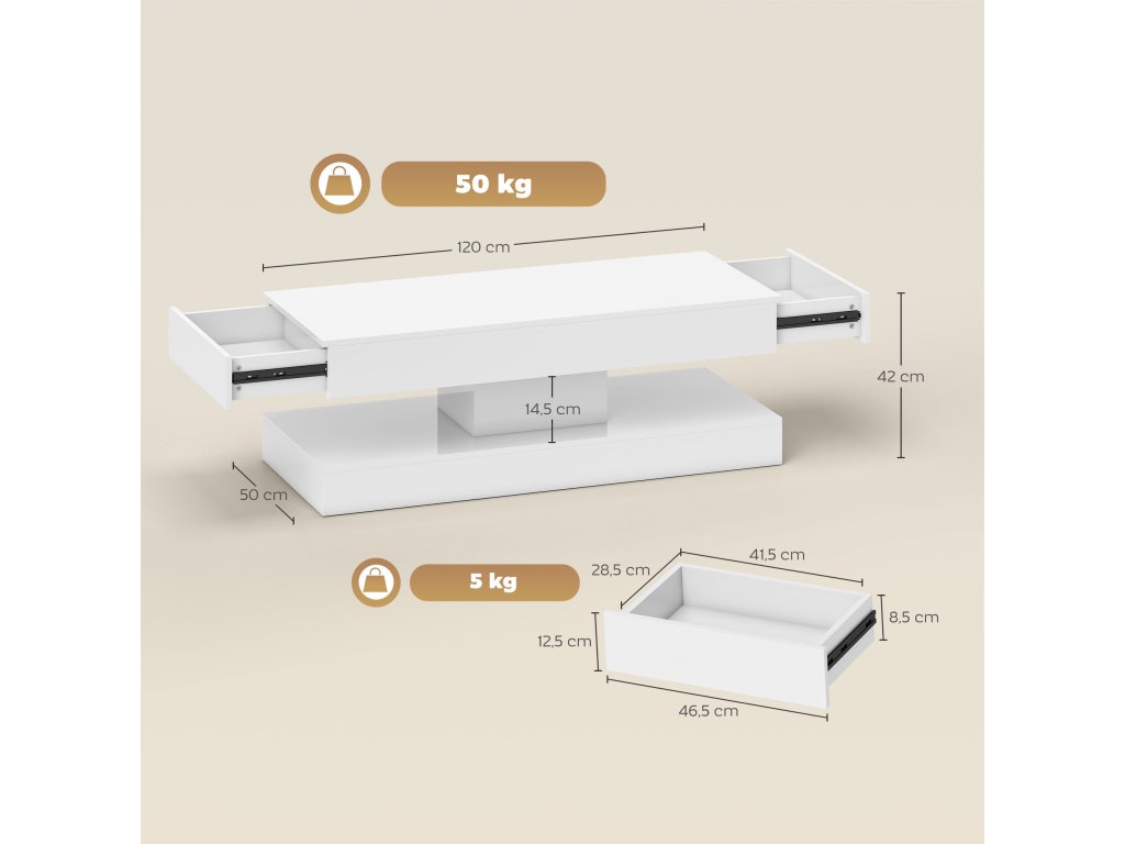 - Informace o výrobku na konferenčním stolku: Celkové rozměry: 120 Š x 50 H x 42 V cm. Nosnost: 50 kg celkem, 30 kg na desku stolu, 5 kg na zásuvku. Včetně baterie pro dálkové ovládání. Nutná montáž