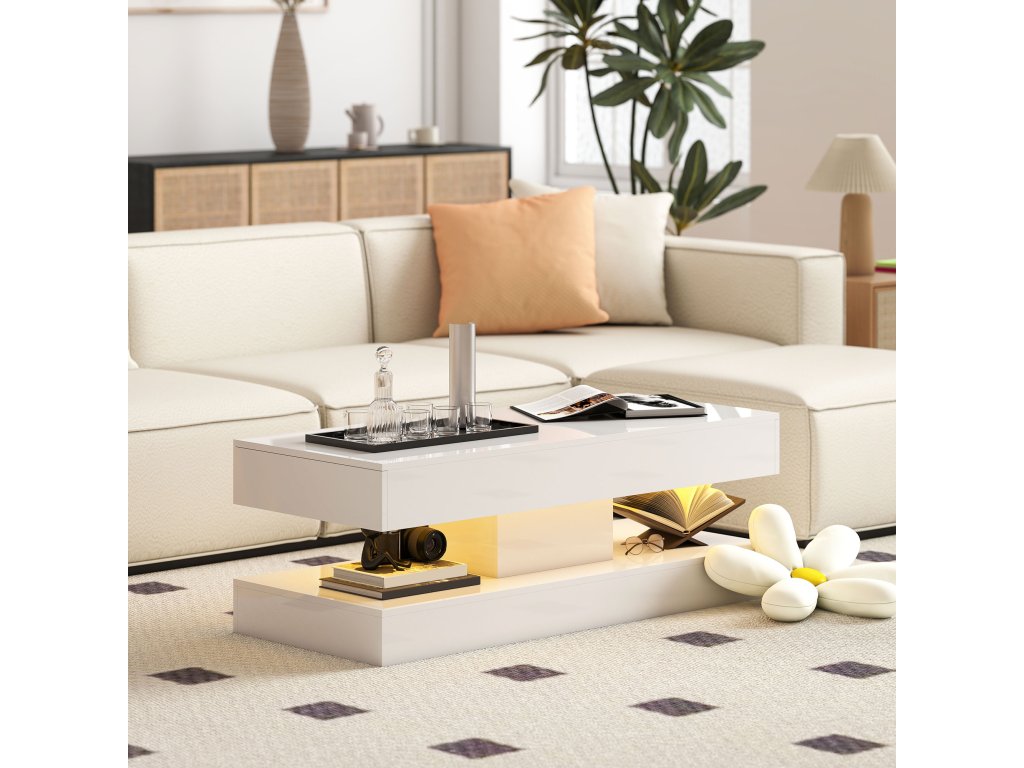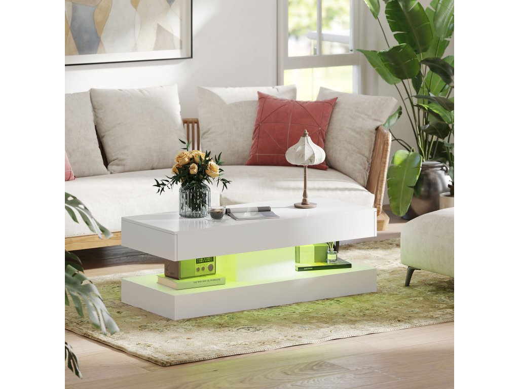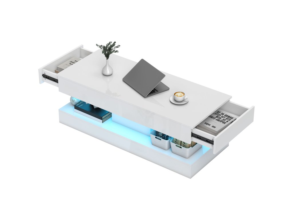 Konferenční stolek HOMCOM se dvěma skrytými zásuvkami zajistí stylovou organizaci ve vašem obývacím pokoji. V horní části vytvářejí zářivá LED světla hřejivou atmosféru a dělají ze stolku atraktivní středobod místnosti. Otevřená přihrádka ve spodní části navíc usnadňuje přístup ke knihám a časopisům.