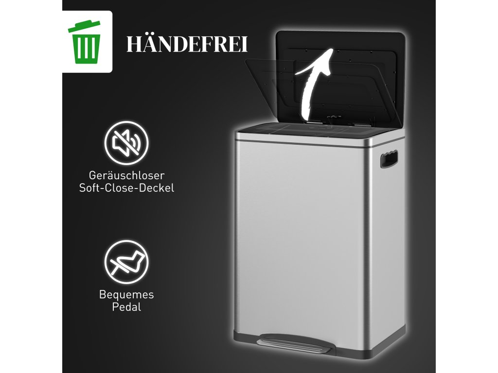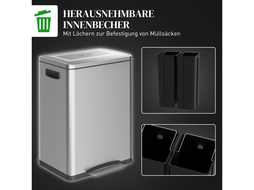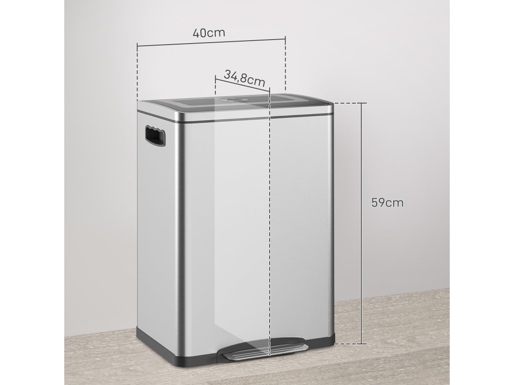 Udržujte své pokoje stylové a uklizené s odpadkovým košem HOMCOM. Tento odpadkový koš s víkem nabízí dvě přihrádky o objemu 20 litrů pro snadné třídění odpadu a povrch z nerezové oceli odolný proti otiskům prstů. Díky víku s tichým zavíráním a nožnímu pedálu je provoz tichý a hygienický, ideální jako elegantní odpadkový koš pod umyvadlo. Zažijte čistší kuchyni s tímto elegantním odpadkovým košem!