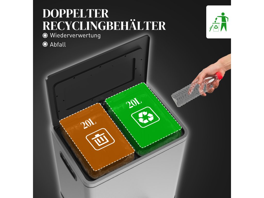 - ✔ Dvě přihrádky o objemu 20 litrů umožňují efektivní třídění odpadu