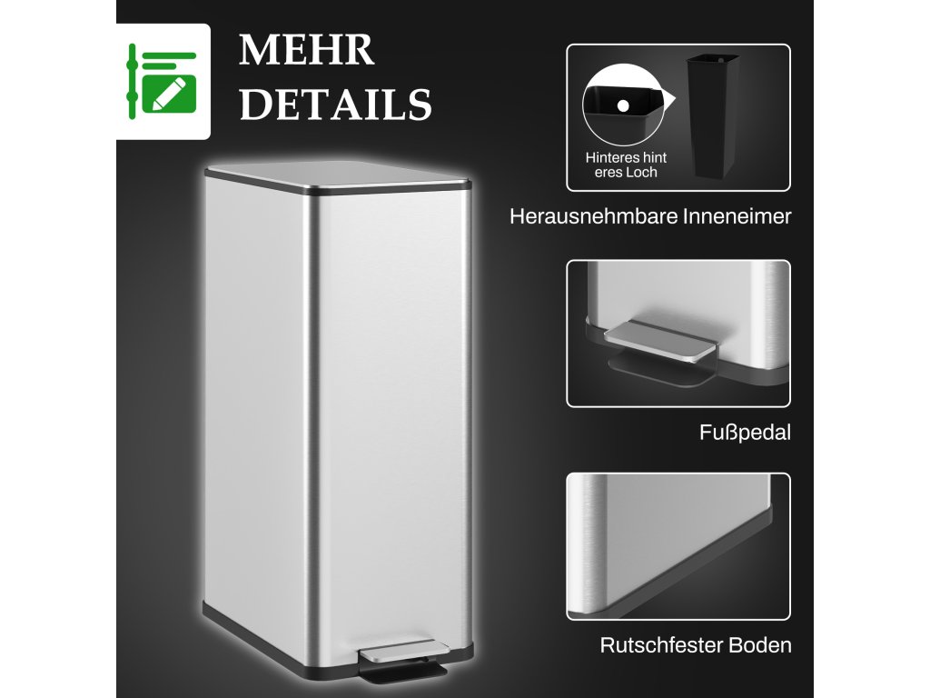 - ✔ Víko koše s měkkým zavíráním a otevíráním s přihrádkou na deodorant (není součástí dodávky) pro kontrolu zápachu