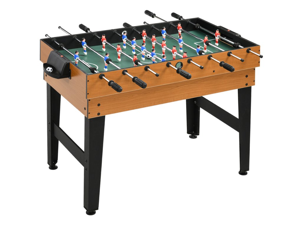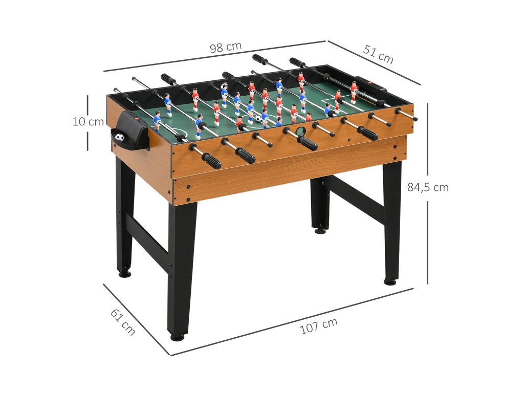 - Robustní konstrukce: Stabilní konstrukce stolní hry z kovového rámu a robustního dřevěného materiálu zajišťuje bezpečné postavení. Dvě příčné vzpěry mezi nohami zajišťují ještě větší stabilitu