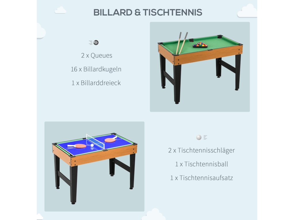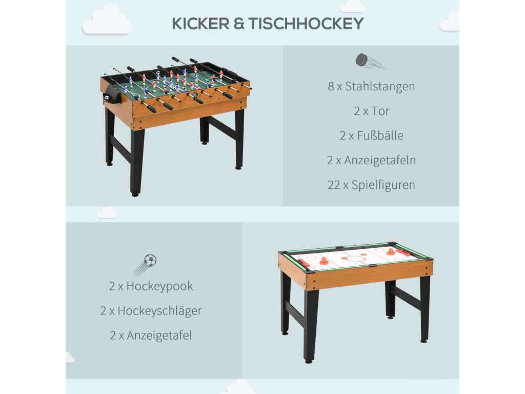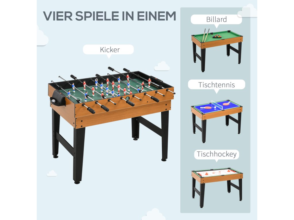 Máte rádi stolní fotbal, nebo spíše stolní tenis? A co třeba stolní hokej nebo minikulečník? S touto skvělou multiherní stolní hrou od společnosti HOMCOM je volba jen na vás! Tato stolní hra je vyrobena z robustního dřeva a kovu, díky čemuž je mimořádně stabilní a odolná. Díky široké nabídce příslušenství a praktickému designu můžete stolní hru snadno a rychle měnit a zajistit tak pestrou zábavu pro malé i velké!