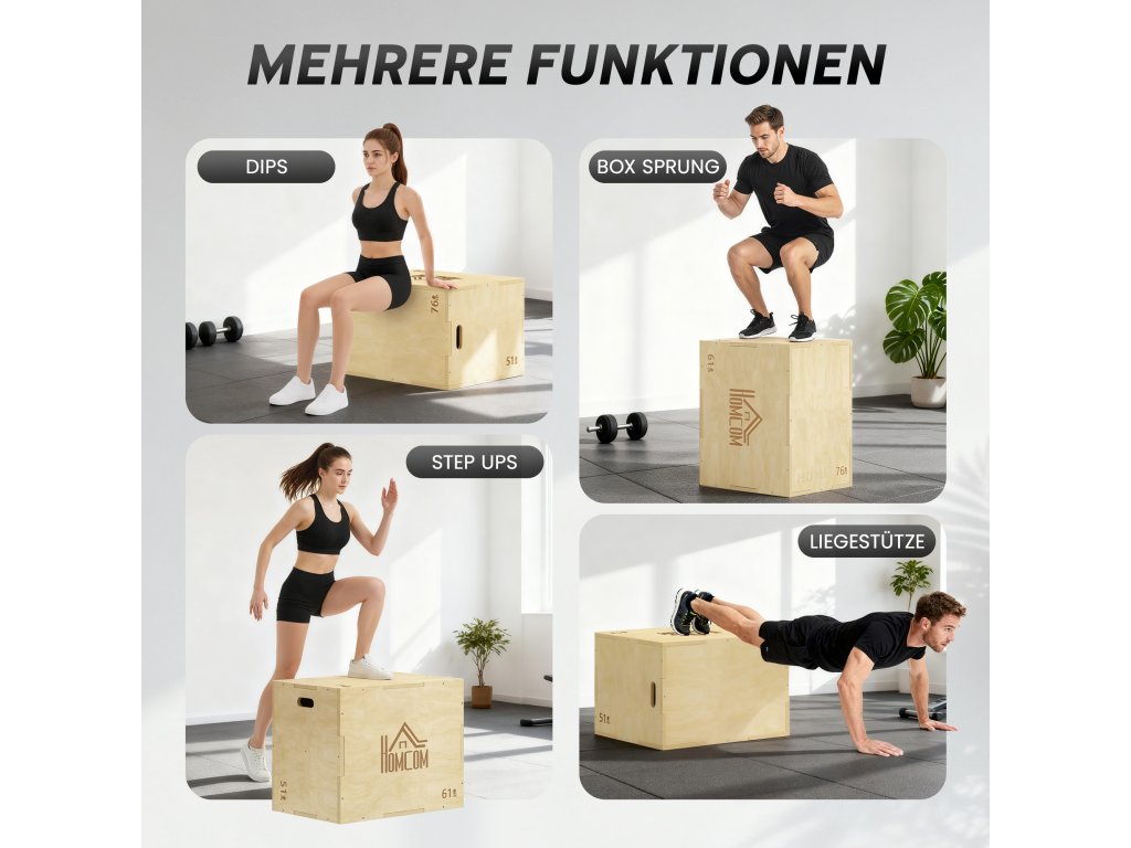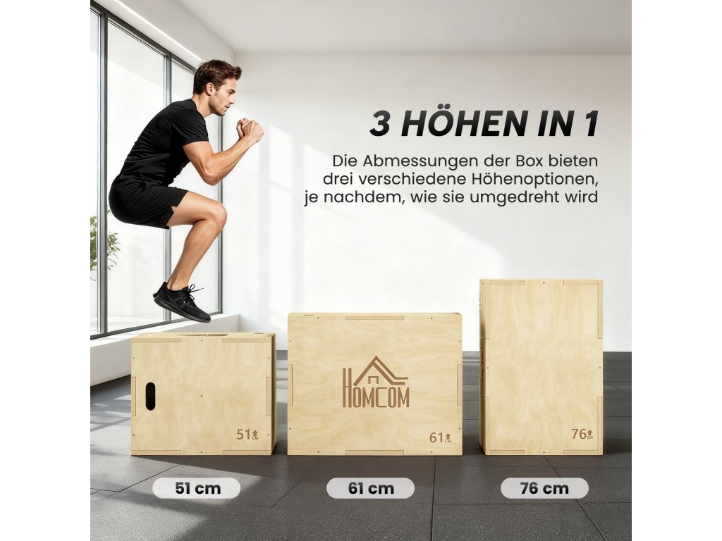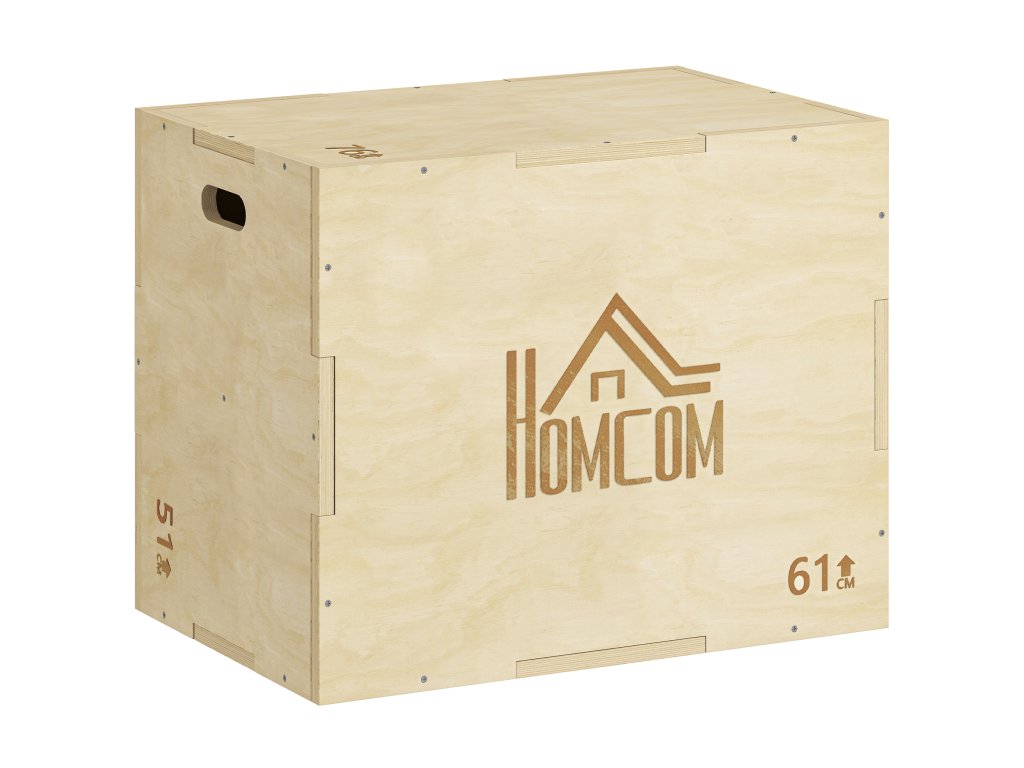HOMCOM Plyo Box 3 v 1 Dřevěný plyometrický box se 3 výškami skoku Úchyty 61 x 51 x 76 cm Přírodní dřevo