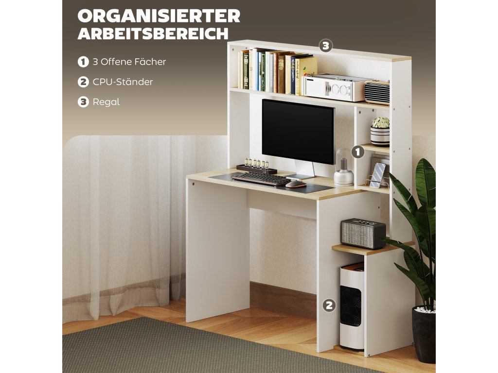 HOMCOM Počítačový stůl, stůl s otevřenými policemi a úložnými prostory, z oceli, světle hnědá+bílá