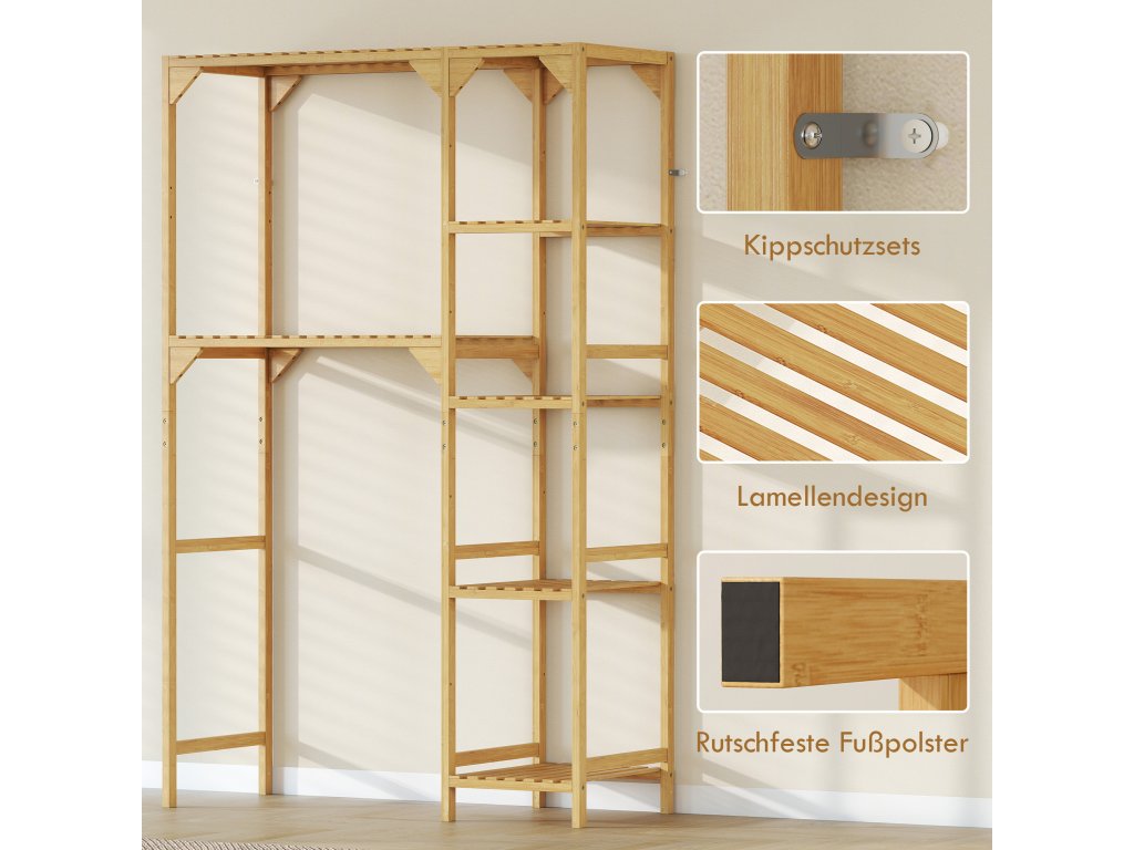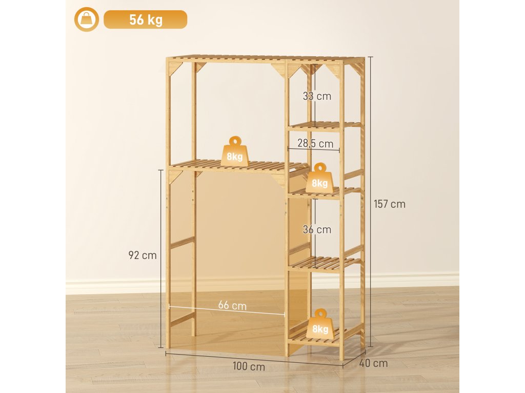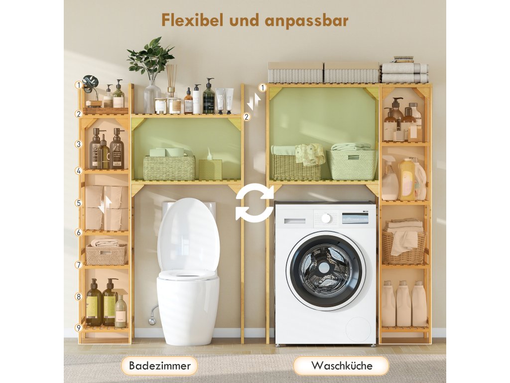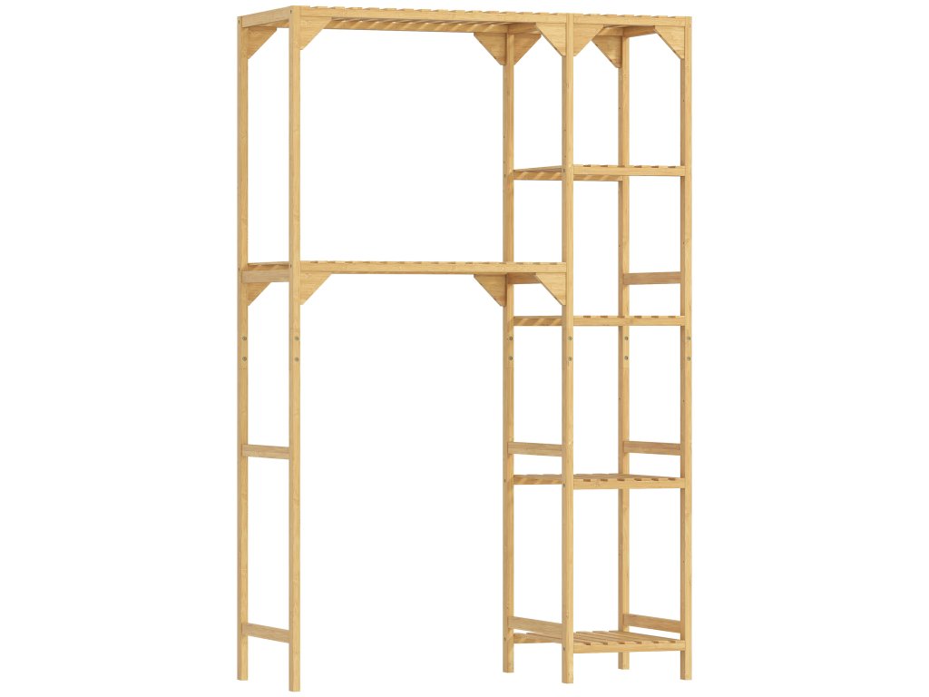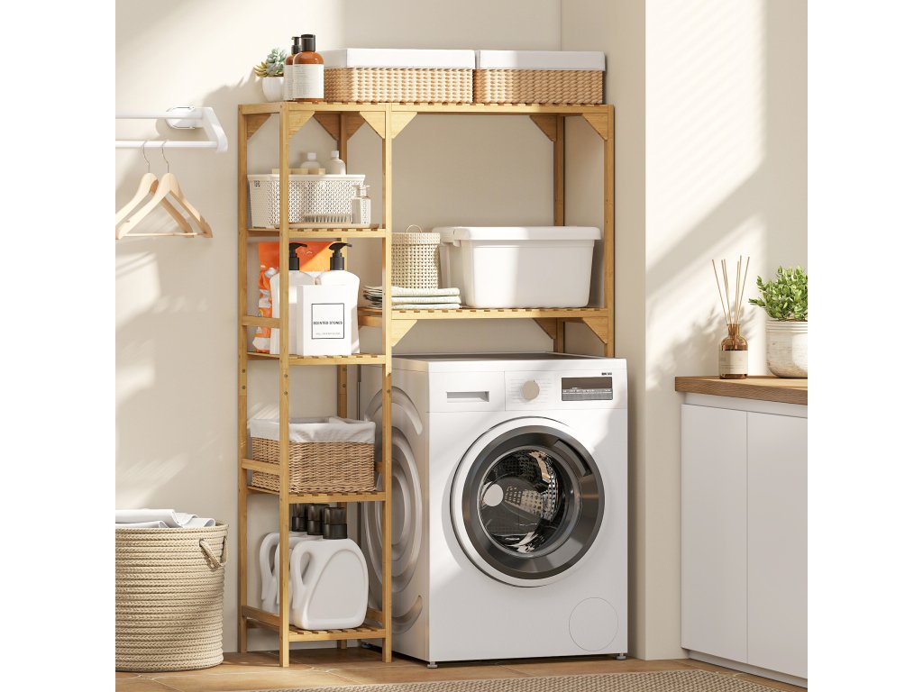 Ve dnech, kdy se vám zdá, že je všechno přeplněné, se vám bude hodit stojan na pračku HOMCOM se sedmi policemi na prací prostředky, ručníky a další užitečné úložné prostory. Pružné nastavitelné police a pevný bambusový rám zvyšují odolnost. Tuto polici nad pračku lze umístit z obou stran pračky a optimalizovat tak vaše prací postupy.