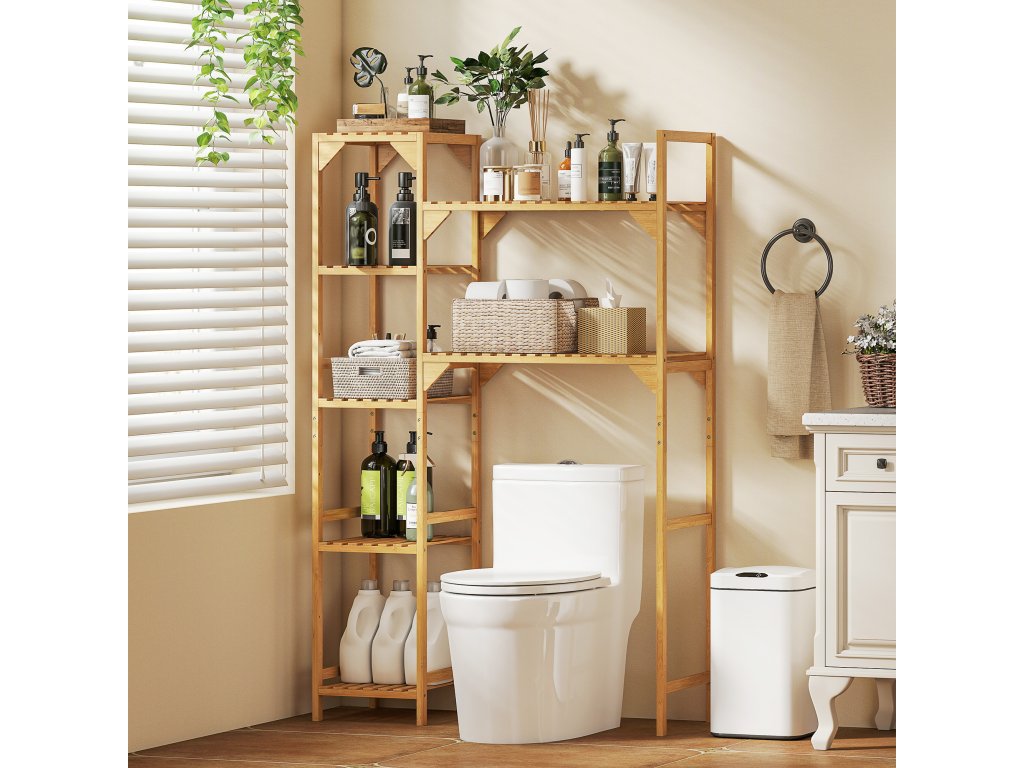 - Přirozená pevnost a stabilita: WC police je vyrobena z lakovaného bambusu pro hladký, vodu odpuzující povrch. Je vybavena ochranou proti překlopení a protiskluzovými podložkami pod nohy, které zaručují každodenní bezpečnost a stabilitu