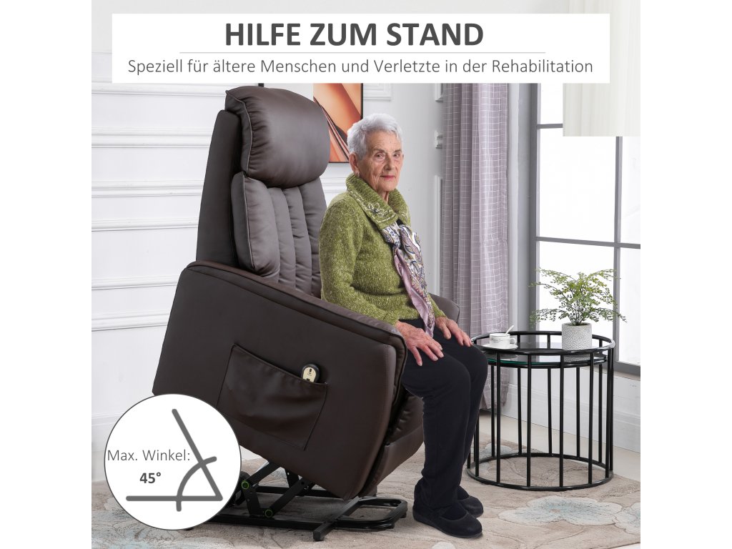 - Důmyslný design: Toto křeslo pro seniory má kapsu, do které můžete pohodlně uložit drobné předměty a knihy a která vám umožní snadný přístup k vašemu oblíbenému nápoji. V případě nepravděpodobného rozlití lze umělou kůži snadno vyčistit vlhkým hadříkem, aniž byste potřebovali oleje nebo vosky.