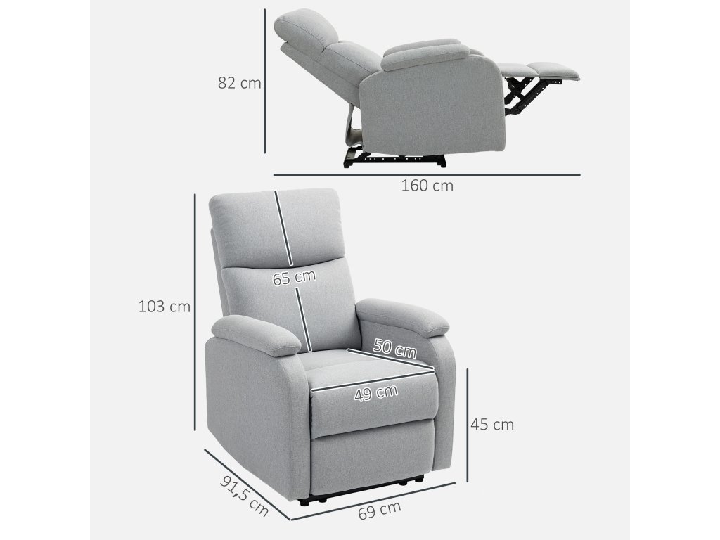 - Informace o polohovacím křesle: Celkové rozměry: (ve vzpřímené poloze) 69 Š x 91,5 H x 103 V cm. (Polohované): 69 Š x 160 H x 82 V cm. Nosnost: 150 kg