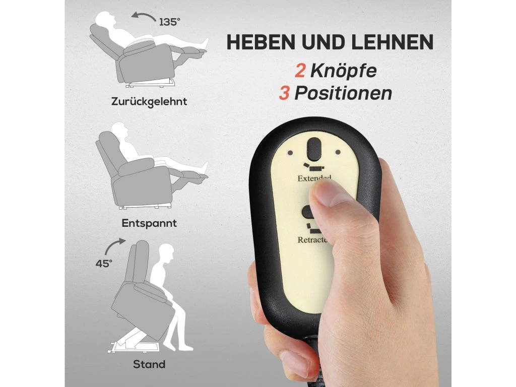 - Zvedání a naklápění: Elektrické polohovací křeslo lze zvednout o 45°, což usnadňuje vstávání, a díky výsuvné opěrce nohou jej lze jemně sklopit až o 135°. Pomocí jednoduchého elektrického ovládání jej lze nastavit do libovolného úhlu - ideální pro starší osoby nebo uživatele, kteří jsou ve fázi rekonvalescence