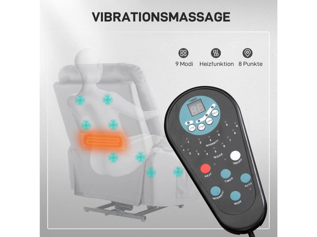 - ✔ 8 vibračních masážních bodů na polohovacím křesle: pro záda, bederní oblast, stehna a nohy, s 9 režimy, 5 stupni intenzity, funkcí časovače a vyhříváním bederní oblasti