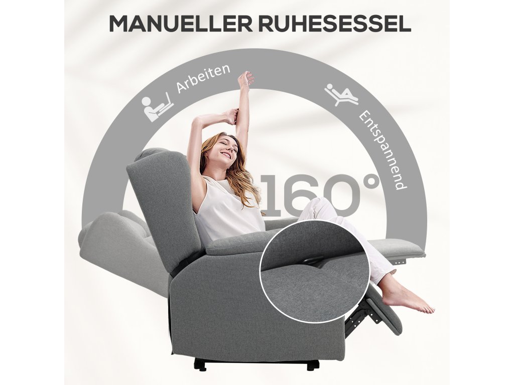 HOMCOM polohovatelné čalouněné křeslo s podnožkou, možnost náklonu 160°, vzhled lnu, rychlá montáž, tmavě šedá barva