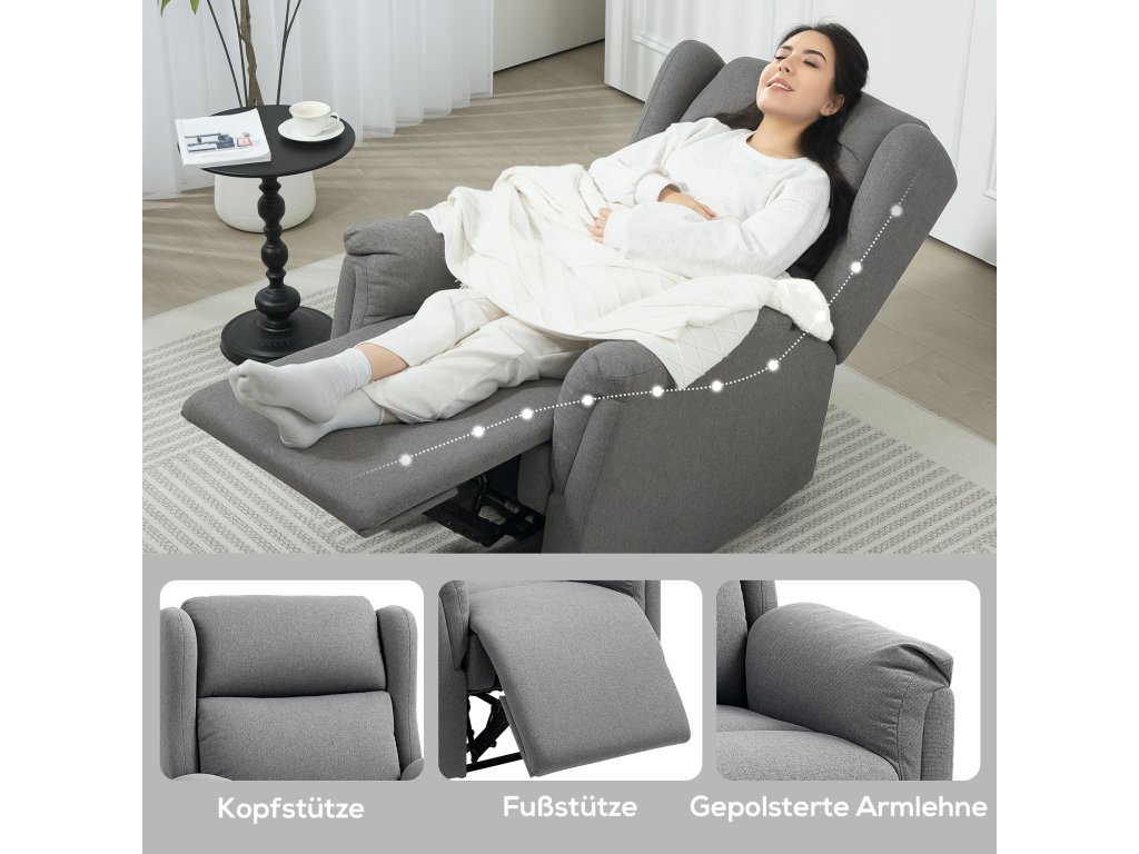 - Relaxace bez námahy: Zažijte dokonalé pohodlí díky opěradlu, které se naklápí až do úhlu 160° a lze jej snadno nastavit rukou, což je ideální pro čtení nebo sledování televize. Nožní část lehátka s funkcí polohování lze vysunout silným tlakem nohou nebo pat.