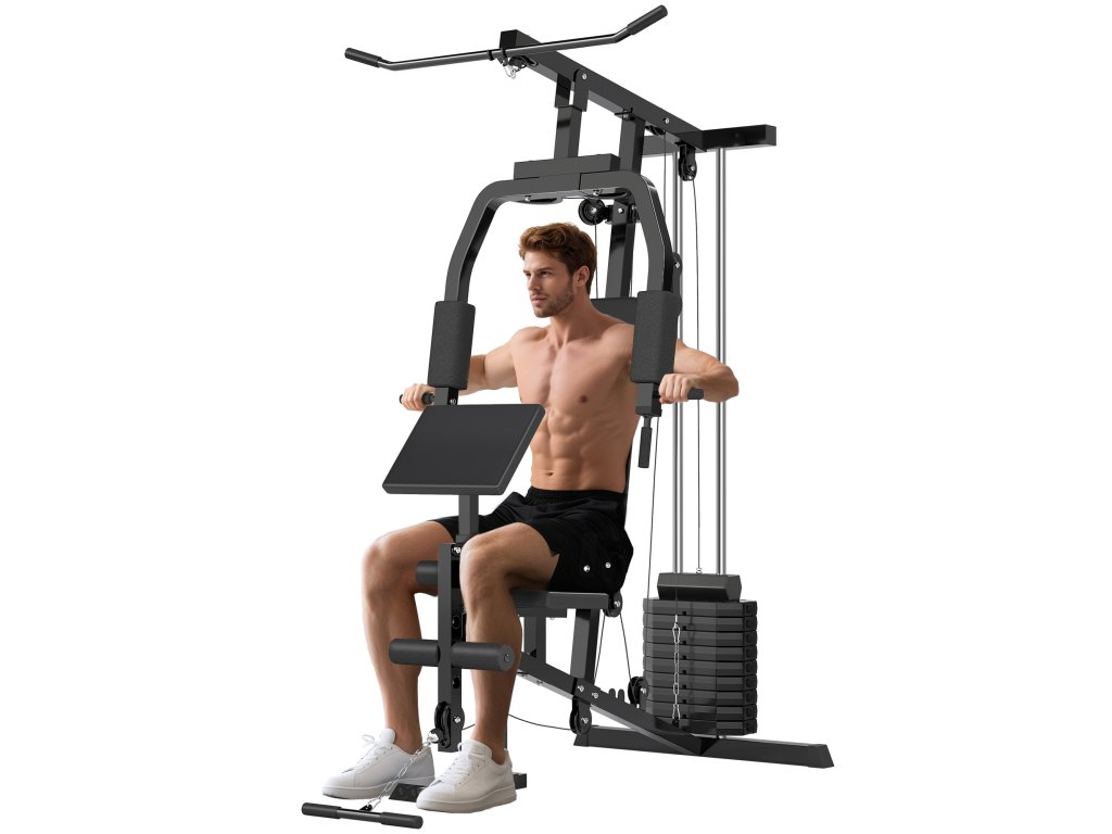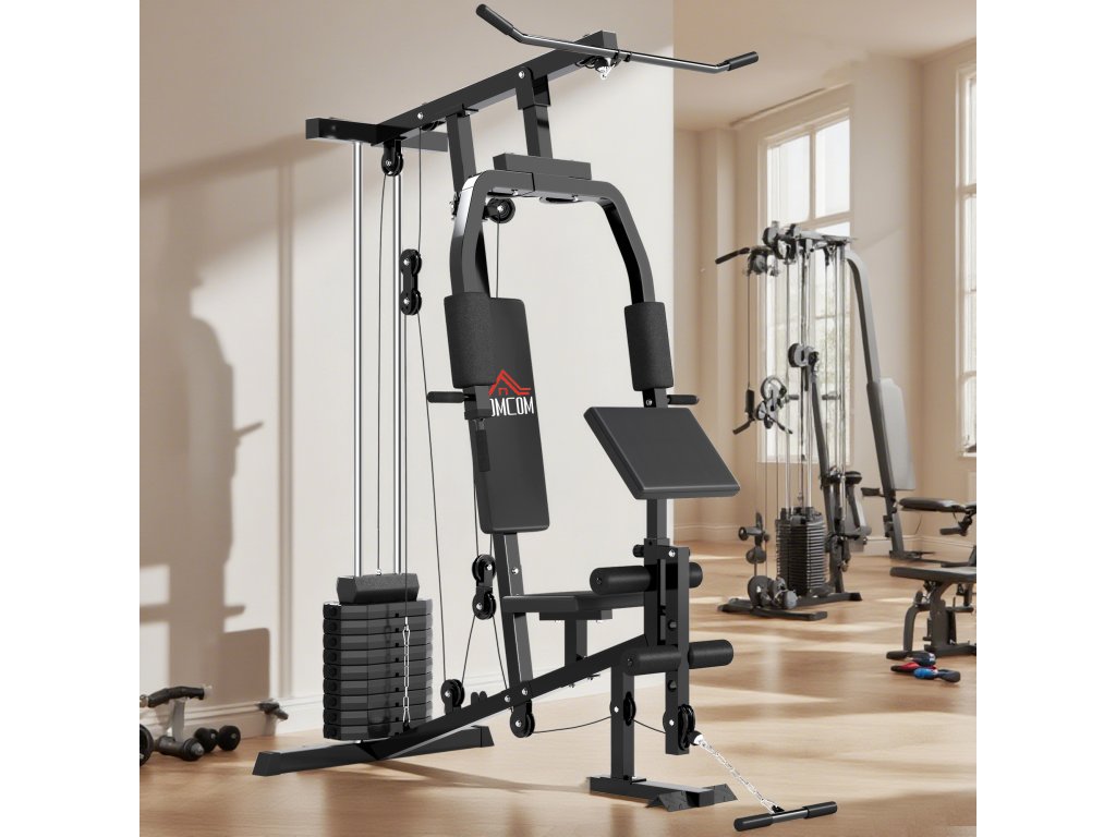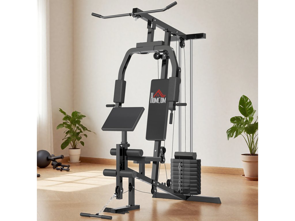 HOMCOM Posilovací stanice pro domácí fitness s lat pull-down strojem, cable pull-down, krátkou bicepsovou tyčí, hrudním lisem, trenažérem nohou, motýlkovým strojem 45kg závaží Multifunkční fitness stanice černá