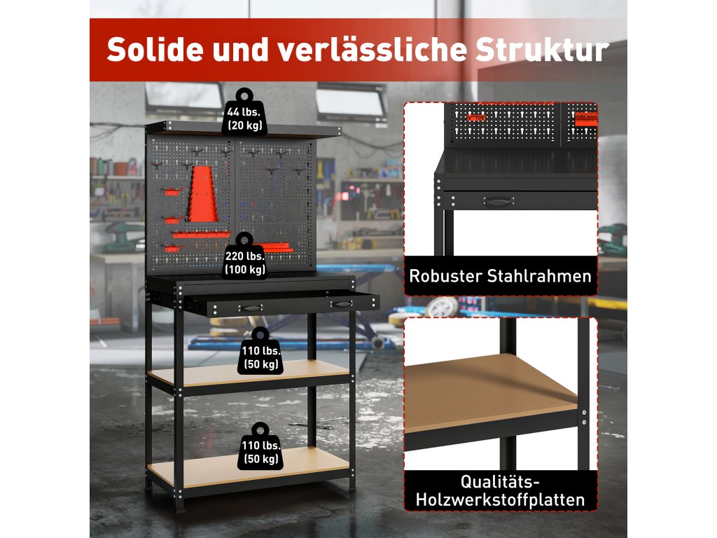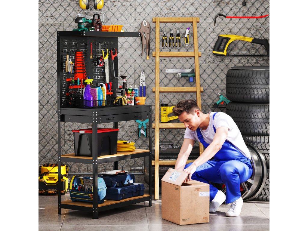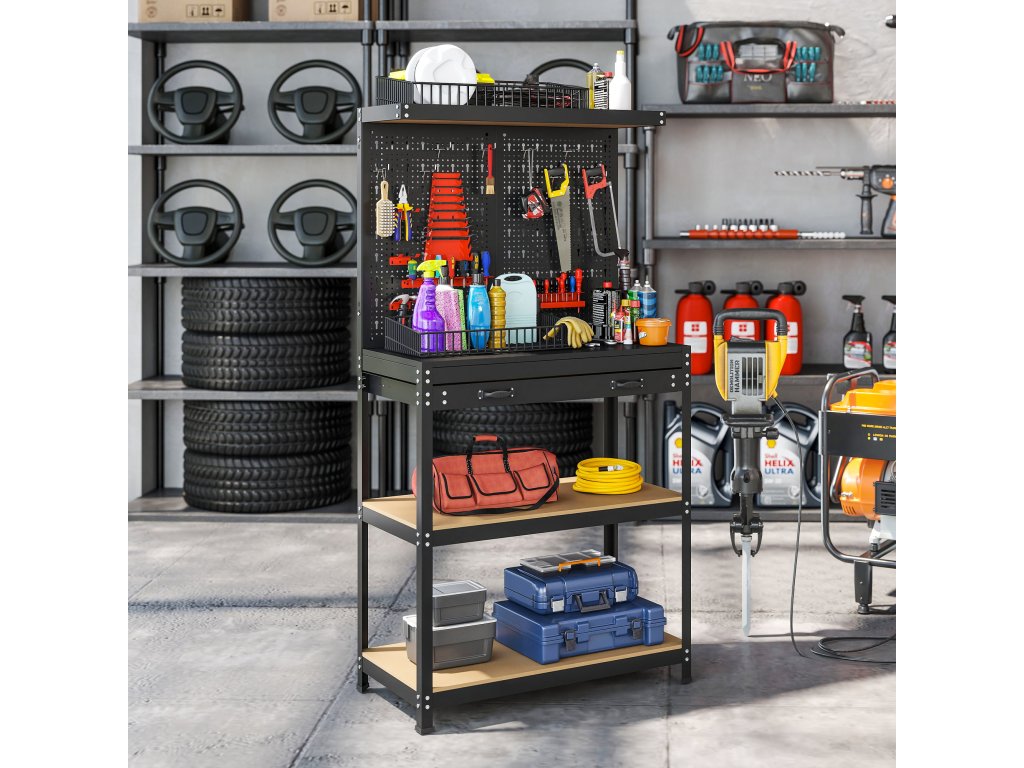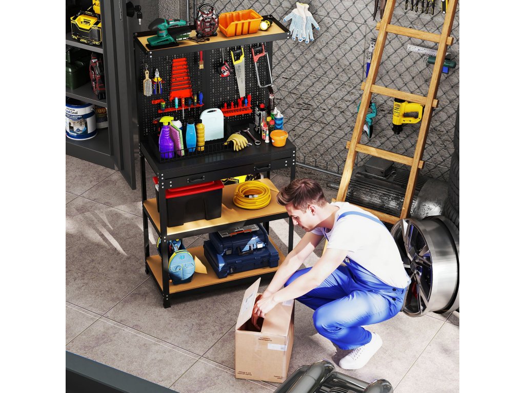 - Víceúrovňový úložný prostor: Využijte svůj dílenský prostor naplno s tímto pracovním stolem, který je vybaven horní policí, velkou zásuvkou a dvěma prostornými policemi. Díky tomu bude váš pracovní prostor uklizený a každé nářadí bude mít své místo.
