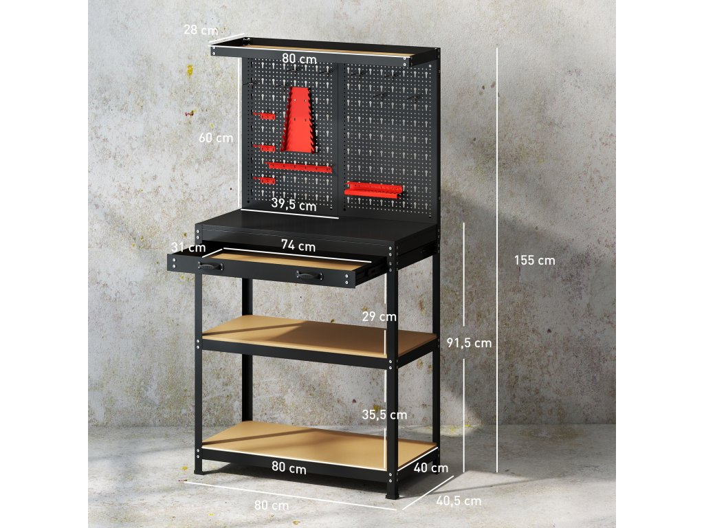 HOMCOM Pracovní stůl 80 x 40,5 x 155 cm Lavice na nářadí s perforovaným panelem, háčky, zásuvkou, 2 policemi pro dílnu Černá barva
