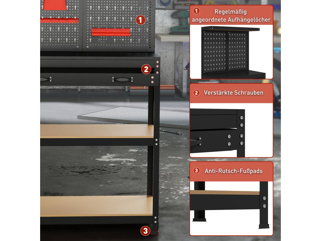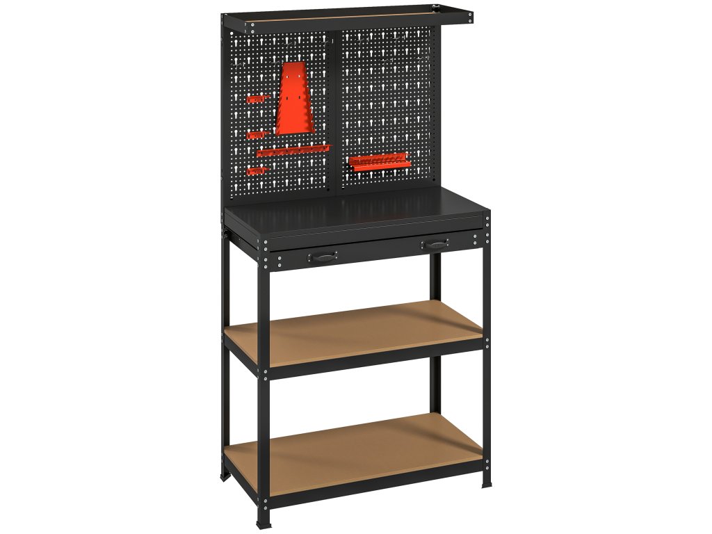 Vadí vám nepřehledný pracovní prostor, kde se ztrácejí nástroje a projekty se viklají? Nepřehledná garáž a nestabilní pracovní plochy činí každý úkol únavným. Pracovní stůl HOMCOM vytvoří efektivní oázu pohody. Jeho robustní rám poskytuje pevnou oporu, zatímco kolíčková deska a víceúrovňové police na tomto pracovním stole udržují vaše nářadí uspořádané a snadno dosažitelné a vnášejí do vaší práce pořádek a bezpečí.
