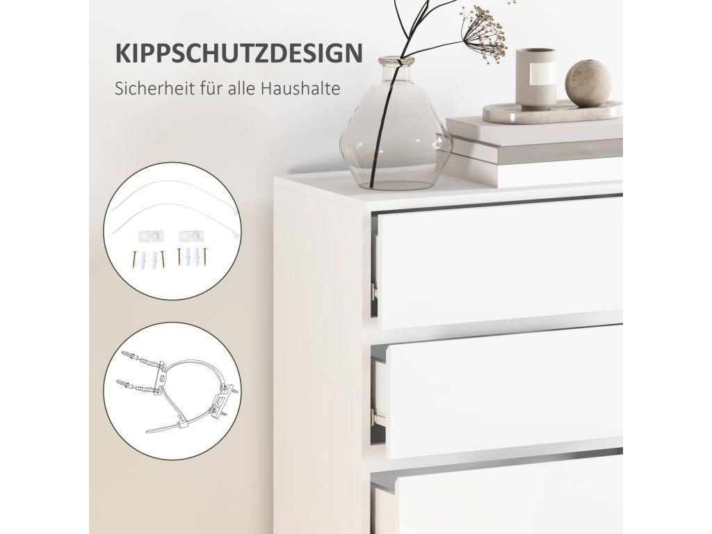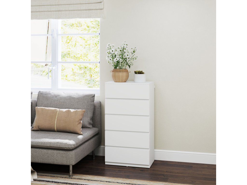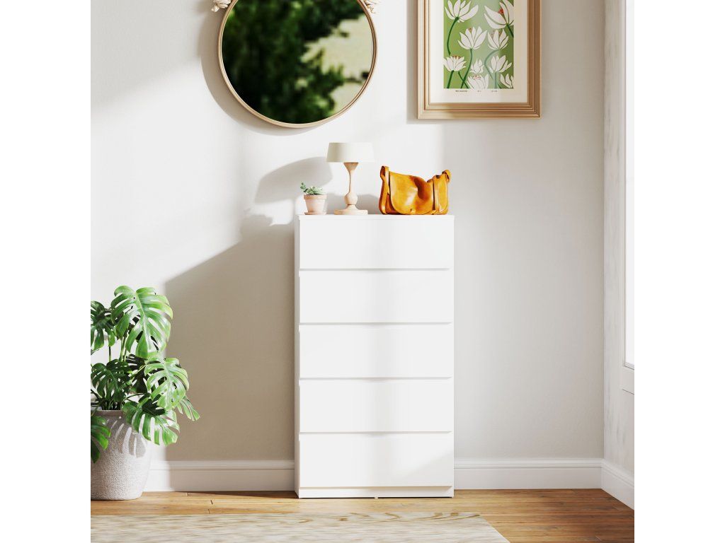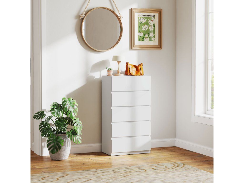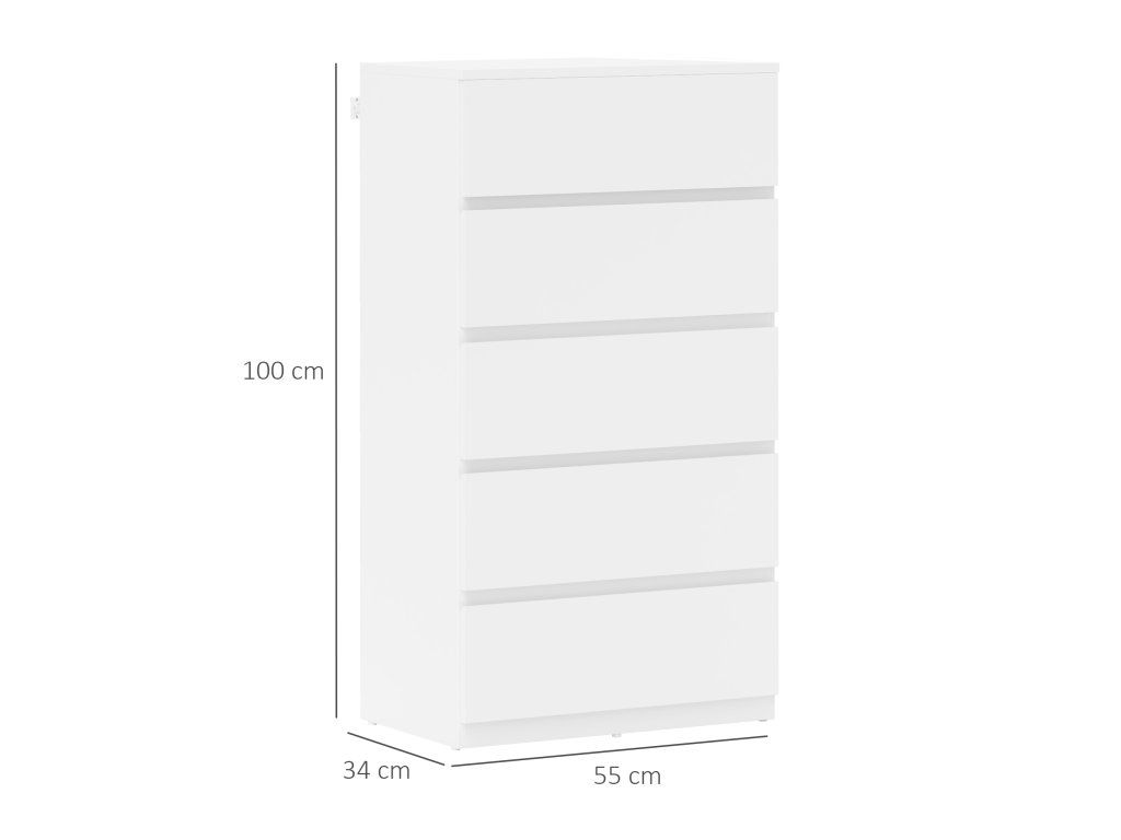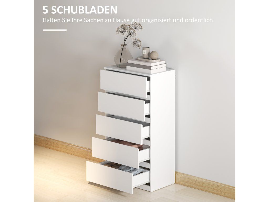 Stylová, prostorná a jednoduchá komoda od společnosti HOMCOM je ideálním řešením pro uložení a organizaci vašeho oblečení. Díky pěti zásuvkám nabízí dostatek prostoru pro různé druhy oblečení a další předměty. Povrch znamená styl - barva je univerzální a lze ji snadno kombinovat s dalšími barvami. Protože nemá žádné úchyty, každá zásuvka se snadno otevírá a zavírá.