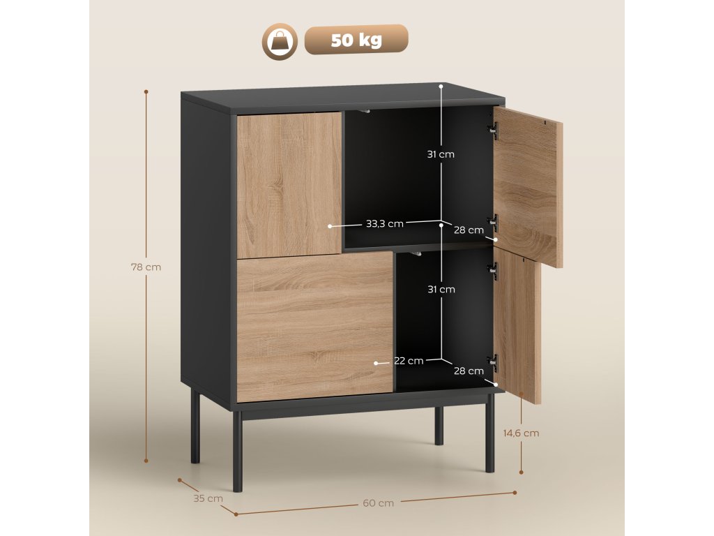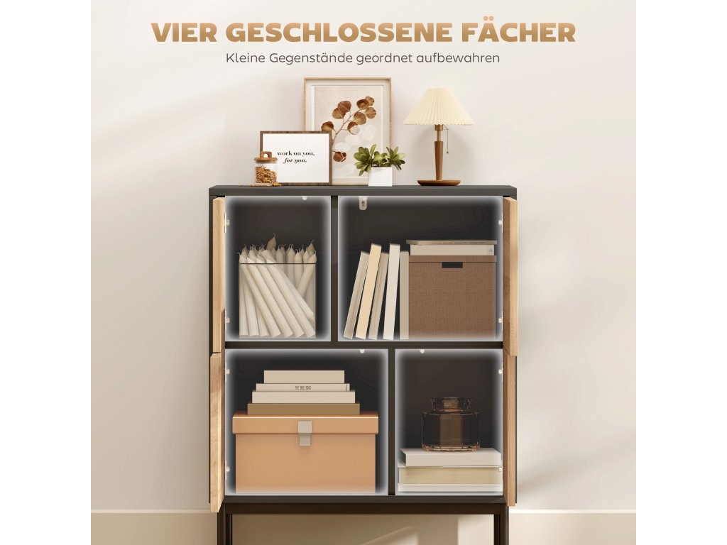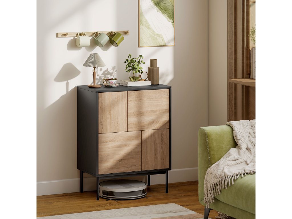 - Prostorná organizace: Čtyři uzavřené přihrádky kuchyňské skříňky nabízejí dostatek místa na knihy, nádobí nebo předměty denní potřeby, abyste měli v obývacím prostoru pořádek a pohodu